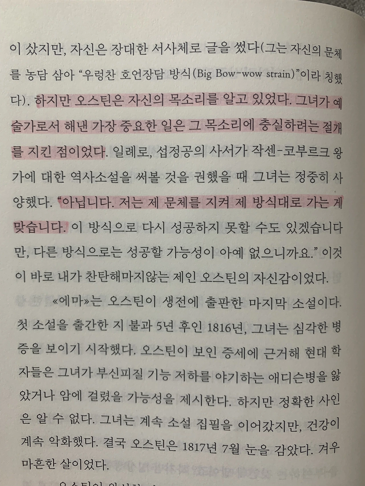 나는 이것이 굉장히 상징적인 사건이라고 생각한다. 나의 오만한 편견과 달리, ‘여류‘ 작가인 제인 오스틴은 정당한 시대정신—계몽주의적 합리성의 계승자로서 자신의 소임을 다했다. 한 시대가 남긴 유산을 활용해 당대의 여성들에게 낭만주의로부터 비켜 나갈 수 있는 길을 제시한 것이다. 그리고 그녀가 조심스럽게 제시한 대안—개인주의적 삶은 또 다른 시대를 여는 열쇠가 되었다. 과거의 유산을 활용해 새로운 시대의 막을 열었다는 점에서, 제인 오스틴은 그 누구도—특히 상류층 남성 작가는 모방할 수 없는 곡예를 펼쳤다. 이제부터 나의 ‘오만과 편견’을 걷어내고 제인 오스틴을 새롭게 읽어볼 작정이다.