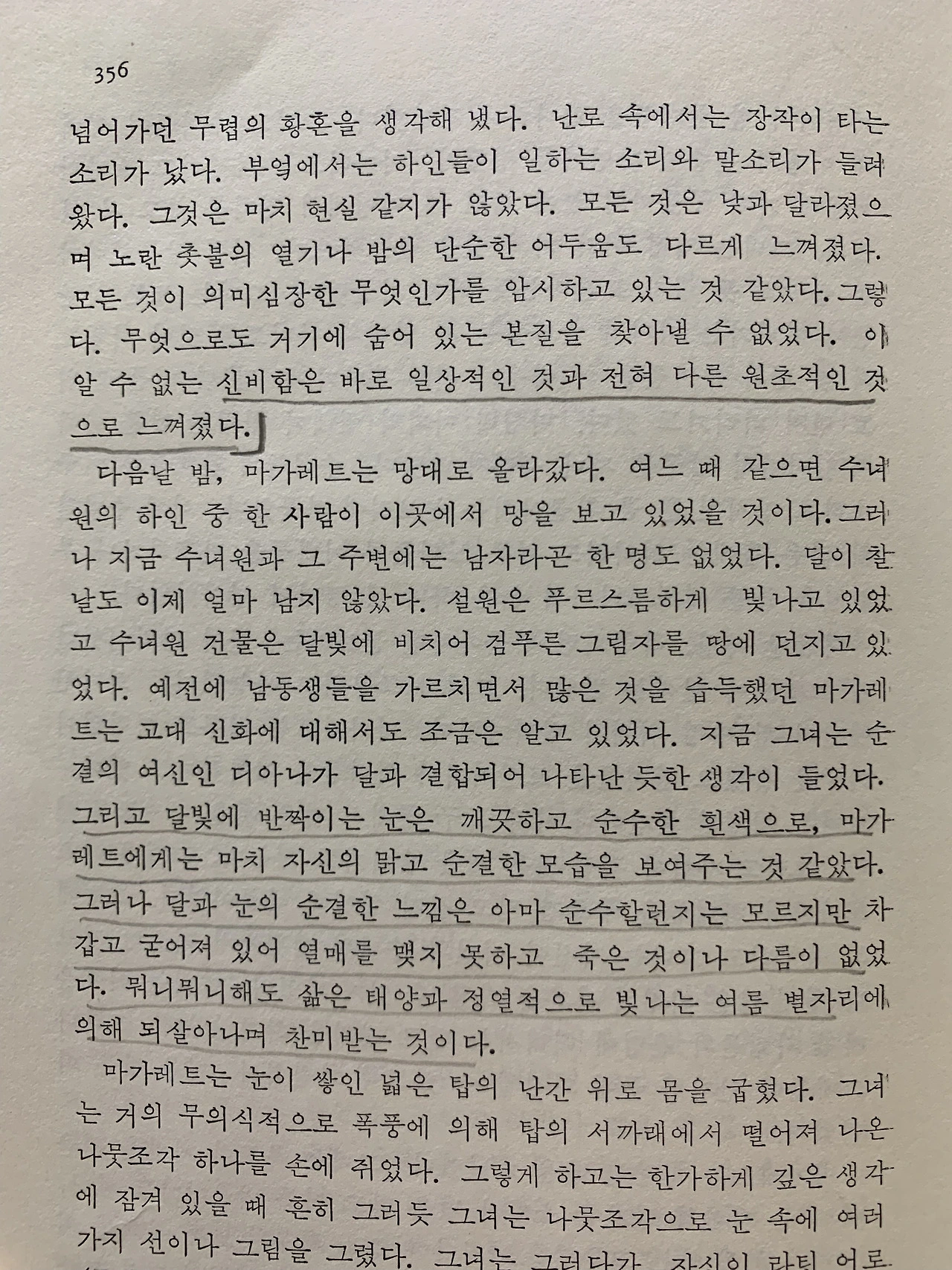 “달빛에 반짝이는 눈은 깨끗하고 순수한 흰색으로, 마가레트에게는 마치 자신의 맑고 순결한 모습을 보여주는 것 같았다. 그러나 달과 눈의 순결한 느낌은 아마 순수할는지는 모르지만, 차갑고 굳어져 있어 열매를 맺지 못하고 죽은 것이나 다름이 없었다. 뭐니 뭐니 해도 삶은 태양과 정열적으로 빛나는 여름 별자리에 의해 되살아나며 찬미 받는 것이다.” p.356