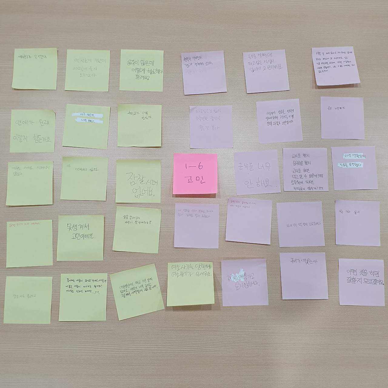 아이들은 포스트잇에 진로 고민 하나, 일상 고민 하나를 적어서 앞으로 냈다.