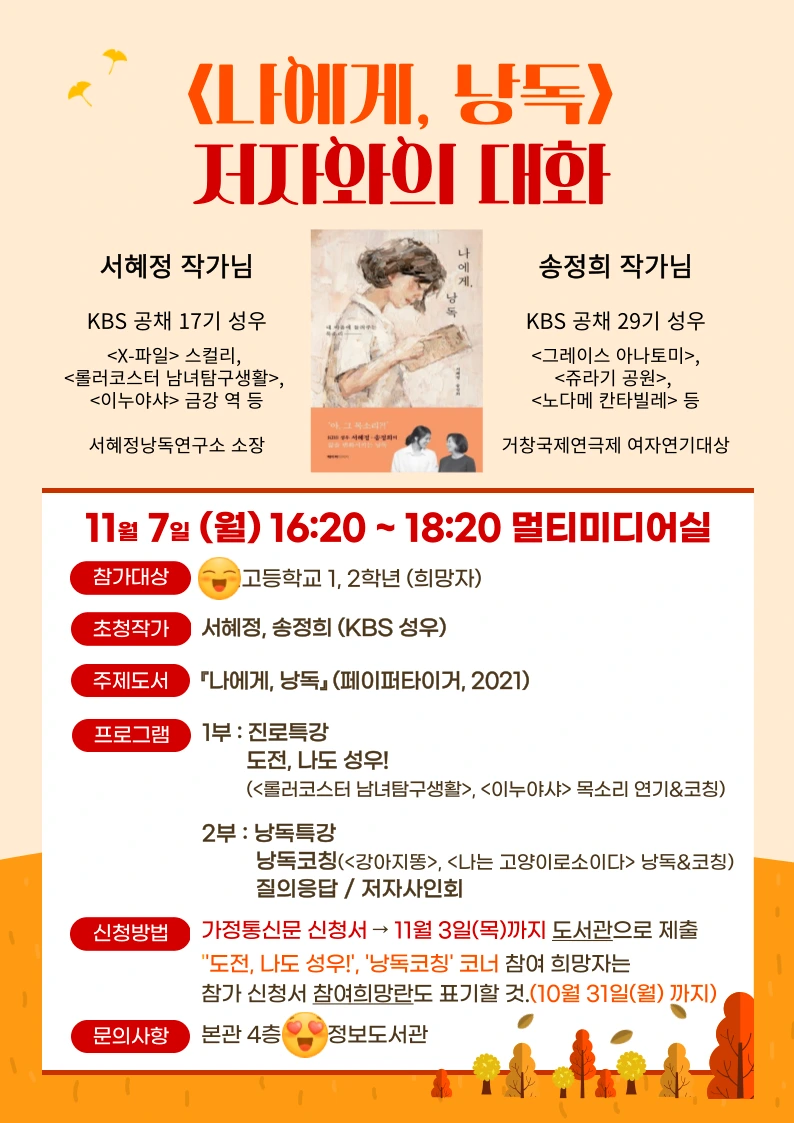 2학기 대체 프로그램을 기획해야 했던 그때, 마음 한편에 숙제처럼 남아있던 ‘낭독’을 떠올리게 됐다. 예산도 생기고, 뭐라도 해야 하는 상황이 되니 용기가 생겼다. 학교에 성우님들을 모시고 가을 낭독 프로그램을 진행해 보기로 했다. 다른 학교 사례를 알아보고, 성우님들의 경험과 내 생각을 종합해서 우리 학교 상황에 맞는 프로그램을 만들어보고 싶었다.