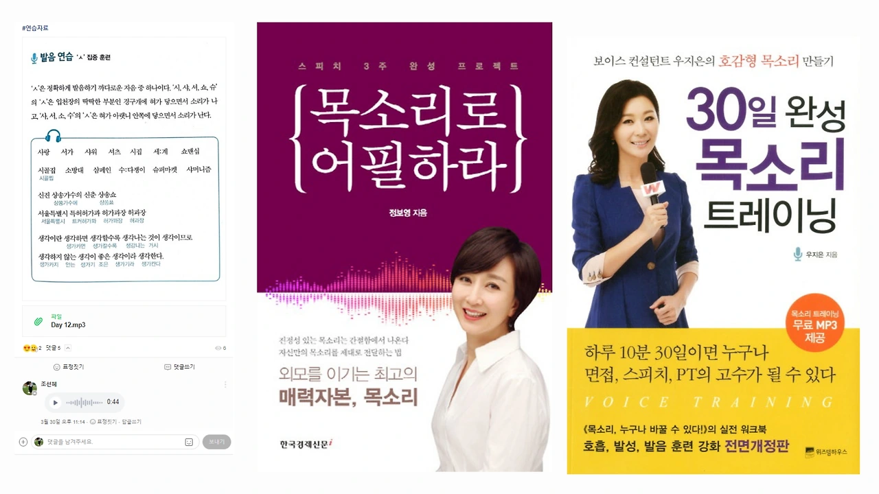 동기 선생님께서 『목소리로 어필하라』와『30일 완성 목소리 트레이닝』 책을 참고하여 매일 밴드에 미션을 올려주셨는데, 그걸 보고 각자 핸드폰으로 텍스트를 녹음하여 올렸다. 하나의 녹음파일을 올릴 때마다 틀리지 않고 정확하게 발음할 때까지 반복했던 것이 꽤 도움이 되었다.