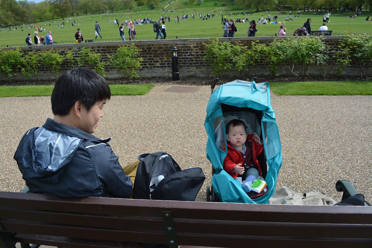 그리니치 선착장에서 천문대까지는 많이 가파르지는 않았지만, 해양박물관을 지나 제법 높은 언덕까지 꽤 걸어 올라가야 했다. 이 날 역시 아침부터 내가 율이를 아기띠에 안고 다니고 있었는데, 저 위쪽까지 걸어올라기 전에 좀 쉬고 싶었다. 그래서 막판 가파른 코스가 나오기 전 잠시 휴식을 위해 벤치에서 앉았다. 쉬는 김에 율이에게 유모차에 앉히는 시도를 해보기로 했다. 암스테르담을 거쳐 런던에 온 지 며칠이 지났건만, 제대로 유모차를 사용해 본 적이 없어 우리 부부는 한탄하며 '리어카'라고 부르고 있었다. 아들보다는 짐을 올려두는 용도로 쭉 사용했기 때문이다. 이 날도 아침부터 가지고는 나왔지만 계속 남편이 밀고만 다닐 뿐, 단 한 번도 율이는 앉지 않았다. 한국에서 새 유모차를 타는 연습을 여러 번 하고 왔는데도 낯선 환경 때문인지 엄마랑 떨어지기가 힘든 것 같았다.