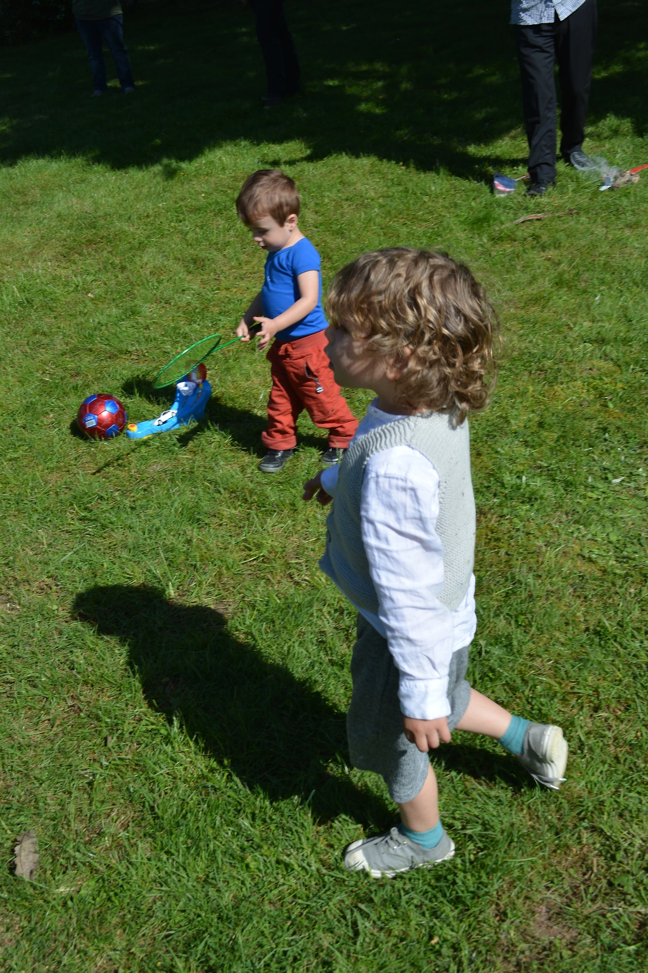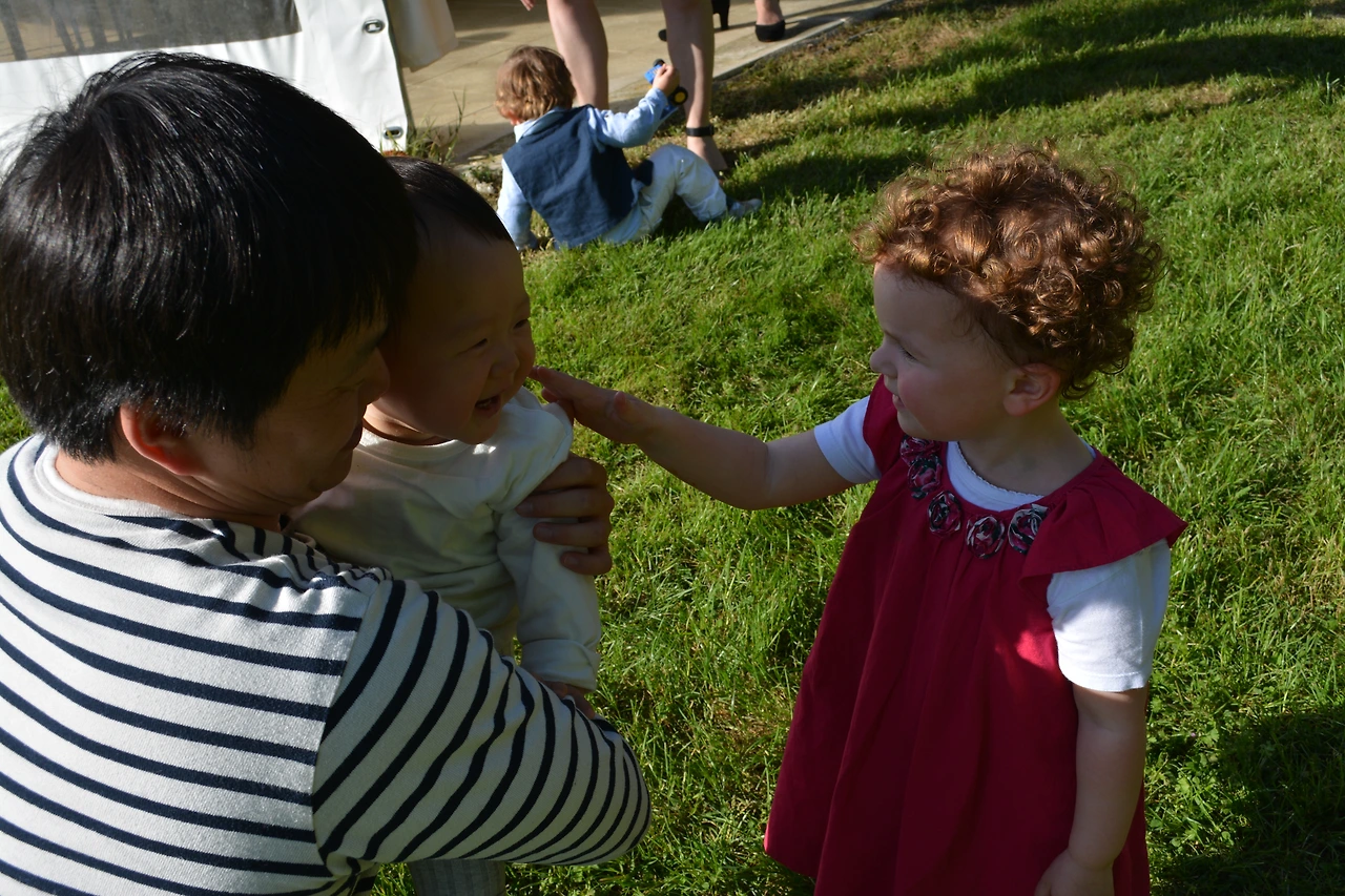 식사가 어느 정도 끝날 무렵부터, 몸이 근질근질해진 아이들이 하나둘 잔디밭에 나가 뛰어 놀기 시작했다. 우리 부부와 율이도 화창한 날씨 속에서 산책을 즐기러 나가 보았다. 이 날 제프 어머니의 친구분께서 파티에 모인 아이들을 위해 여러 가지 소품들을 봉투에 예쁘게 포장해 와서 나누어 주었는데, 아이들에게 인기 만점이었다. 율이는 아직 어려 직접 가지고 놀지는 못했지만, 선물 봉투를 골라 풀어보고 율이에게 보여주느라 우리 부부가 더 신이 났다. 대단한 장난감은 아니지만 후~ 불면 긴 혀처럼 길어졌다 말리는 빨대, 피에로 코, 귀여운 집개핀 같은 작은 소품들로 한참을 웃고 떠들었다. 그리고, 우리에게 호기심을 가지고 다가오는 아이들과 교감하기도 하고, 잔디에 앉아 햇살 아래 신나게 아이들이 뛰노는 것을 바라보기도 했다. 이곳에서 만난 아이들이 잔디에 아무렇게나 눕고 뒹굴기도 하고 땀을 뻘뻘 흘리며 달리는 것을 보니, 율이도 저렇게 신나게 뛰어 놀 줄 아는 아이로 자랐으면 좋겠다는 생각이 들었다.