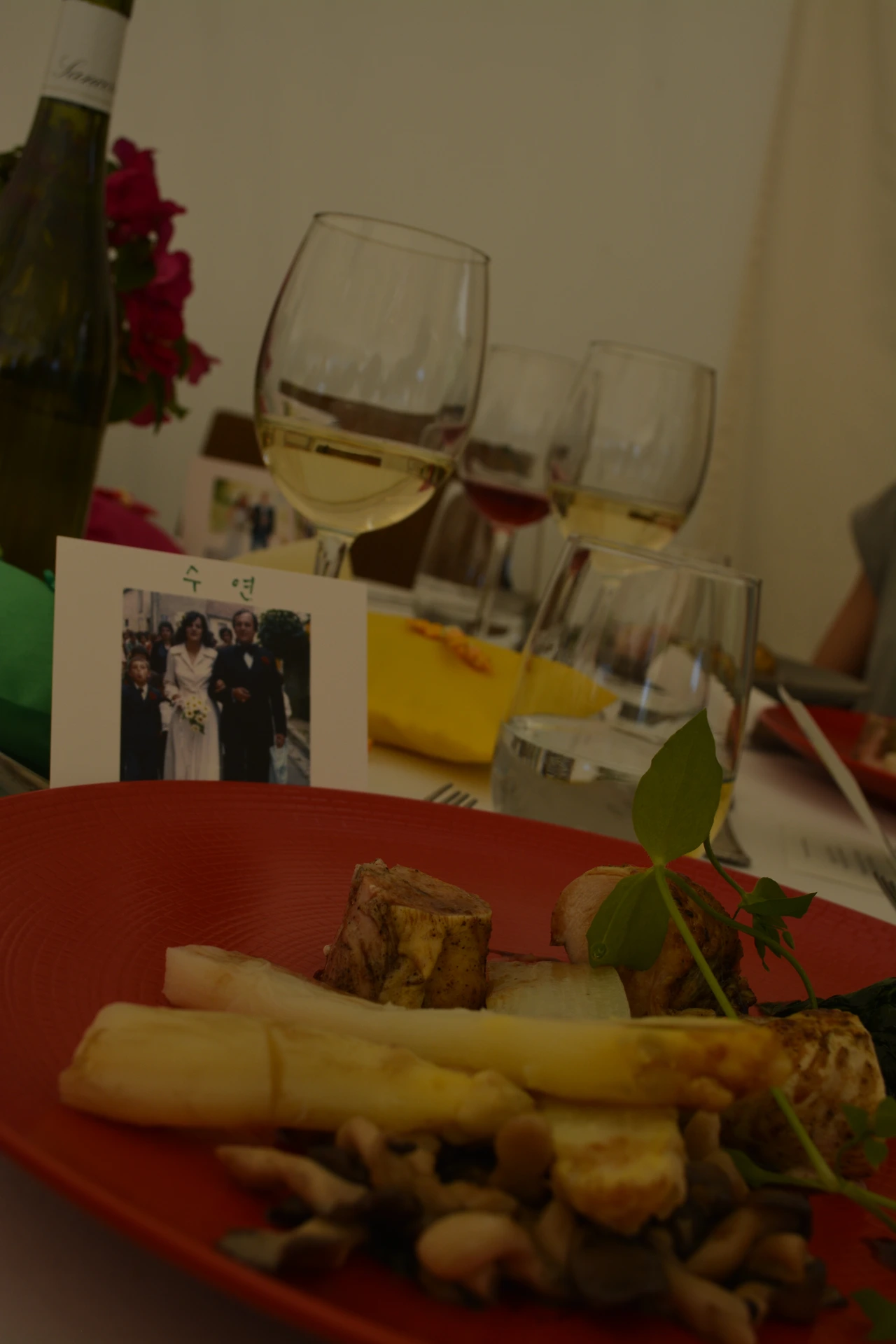 춤이 끝난 뒤, 잔디밭 한쪽에 만들어진 흰 천막 건물로 이동해 식사를 시작했다. 말로만 듣던 '프랑스 코스요리'였다. 프랑스 코스요리를 정식으로 먹으려면 몇 시간에 걸쳐서 먹어야 한다고 알고 있어 조금 긴장하고 있었는데, 다행히 이 날은 그렇게 긴 코스는 아니었다. 전채요리부터 시작해 메인, 디저트까지 사람들은 이야기를 나누며 천천히 식사를 했지만, 평소 한국에서 먹던 코스요리와 크게 다르지 않았다. 다양한 종류의 와인이 테이블에 놓이는 것이 조금 새로운 정도였다. 우리와 같은 테이블에 앉은 사람들은 제프의 사촌과 친한 친구들의 가족이었는데, 모두 아이를 동반하고 있었다. 그래서 편하게 서로의 아이에 대해 물어보기도 하고, 한국에 대해, 각자가 살고 있는 도시에 대해 이야기를 나누기도 했다. 특히, 아기들에 대한 이야기는 분위기가 살짝 어색해질 때 꺼내기 좋았다. 역시 아이들이 애매한 분위기를 부드럽게 해주는 것은, 세계 어딜 가나 공통적이라는 생각이 들었다.