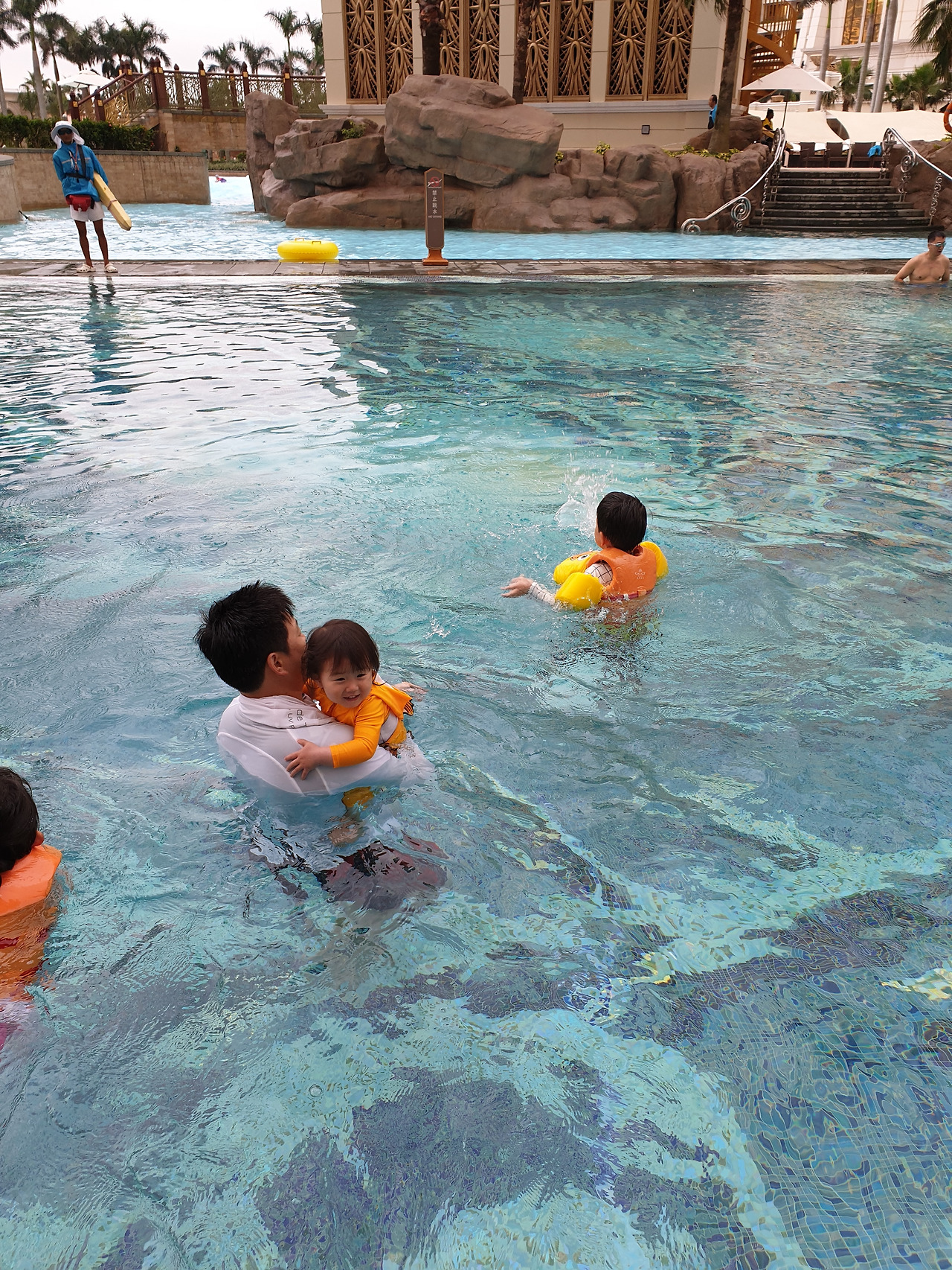 짜잔~ '역시는 역시'라고 하더니! 풀장에 들어서자마자, 글과 사진으로만 보던 것을 실제로 눈 앞에 마주했을 때의 짜릿한 희열이 느껴졌다. 사람들이 괜히 '대륙 스케일'이라고 하는 게 아니었다. 다양한 깊이의 풀, 유수 풀, 분수가 나오는 유아용 물놀이장, 모래사장까지 갖추어진 얕은 풀, 인공 파도 풀, 자쿠지 등등 없는 것이 없었다. 오랜만의 물놀이 이기도 했고, 시설이 워낙 훌륭하다 보니 율이는 신이 나서 퐁당거렸다. 나도 이렇게 재미있는데 율이는 이미 초 흥분상태였다. 쉬지 않고 아빠를 끌고 다니며, 이쪽 풀에서 저쪽 풀로 신나게 다녔다. 린은 큰 규모의 수영장이 조금 무서웠는지 초반에는 찰거머리처럼 나에게 안겨있었지만, 워낙 물을 좋아하다 보니 금세 친숙해졌다. 아직 흐린 초 여름 날씨라 다행이었지, 날이 조금만 더 더웠다면 여기서 주~욱 살고 싶다는 생각이 들 정도였다. 시설이 크고 물이 깨끗한 것도 좋았지만, 아이들과 함께하다 보니 풀장마다 라이프 가드들이 위험한 상황을 대비해 지켜보고 있는 것이 든든했다.