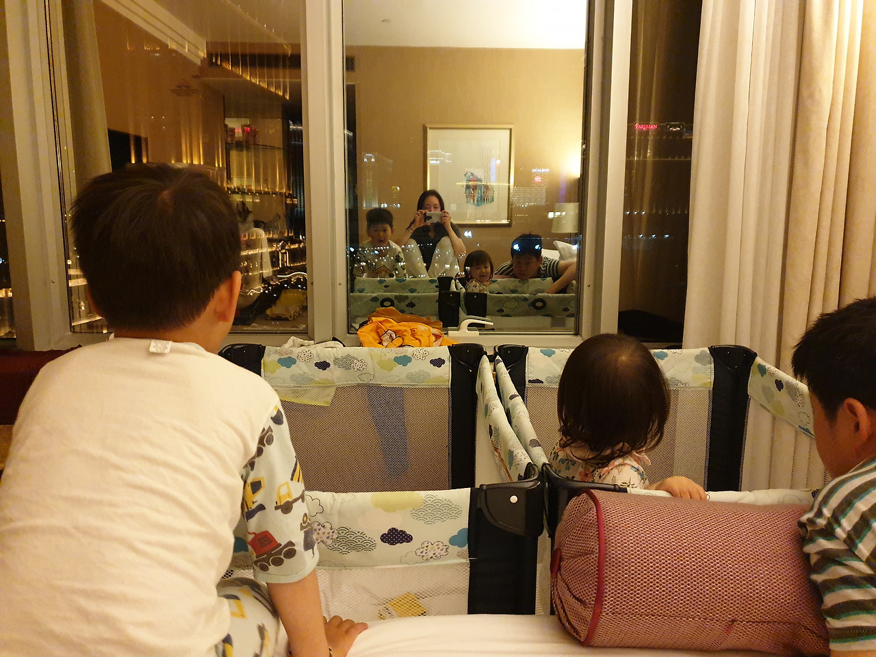 창 밖을 바라보다 넷이 사진 찍기 성공그런데 생각보다 아이에게 이 조명들은 인상이 깊었던 것 같다. 여행을 다녀온 지 한 달쯤 되었을 때다. 아파트 옆으로 난 산책로를 따라 저녁 산책을 하는데, 가로등 불빛을 보고 있던 율이 "엄마, 이렇게 반짝이는 걸 보니까 마카오 생각이나. 우리 또 언제 마카오 갈 거야?" 하고 말하는 것이었다. 사실 이번 여행은 이제껏 다녔던 여행들에 비해 크게 하는 일 없이 단조로운 일정이었다. 그래서 아이들에게는 별로 남는 것이 없을 거라고 생각하고 있었는데, 의외의 부분을 기억해준 것이 신기하고 재미있었다. 어쩌면 여정이 심플했기에 율이에게는 이런 시각적인 여행의 잔상이 더 짙게 남았을지도 모르겠다는 생각이 들었다.
