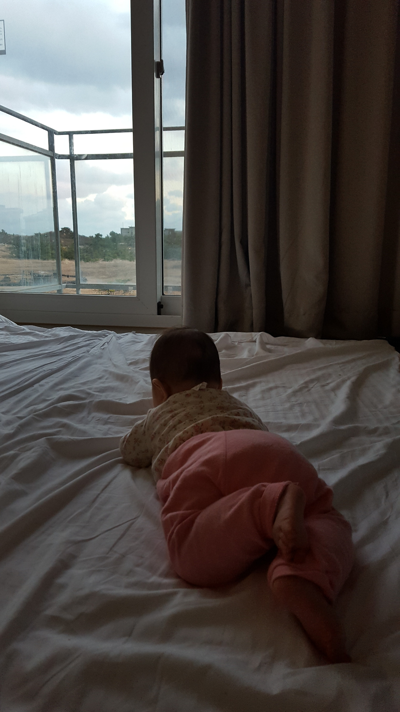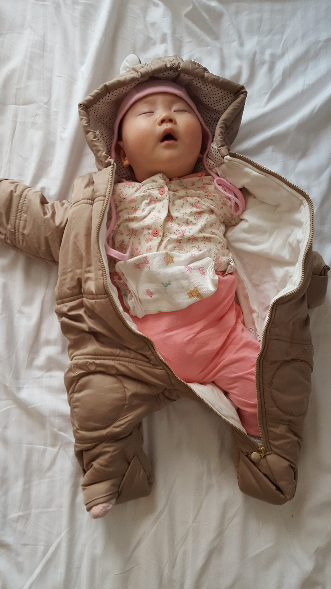 그리고 두 번째는 김포 공항에서 집으로 가는 택시 안에서 맞이했다. 2박 3일 내내 순하기만 했던 린이 택시 안에서 갑자기 대성통곡을 시작한 것이다. 올림픽대로가 조금 막히는 상황이었는데 너무 심하게 울자 나도 기사님도 많이 당황한 상태였다. 이래저래 달래어 보아도 큰 효과가 없었는데, 이제 어떻게 해야 하나 하고 아이를 잠시 바라보고 있자니 아차 싶었다. 히터가 나오는 택시 안에서 옷을 너무 두껍게 입힌 채로 아기띠까지 하고 있었던 것이다. 날이 추운 것만 생각했지 실내에서 아이의 컨디션까지 챙기지 못했다. 좁은 택시 안에서 내 잠바를 벗고 아기띠를 풀고 아이 옷을 벗기고 다시 아기띠로 안고...한바탕 난리 끝에 겨우 린을 진정시킬 수 있었다. 아파트 주차장에 도착해서는 택시에 벗어던진 옷들을 다시 주섬주섬 챙기고서야 무사히 집까지 갈 수 있었다.