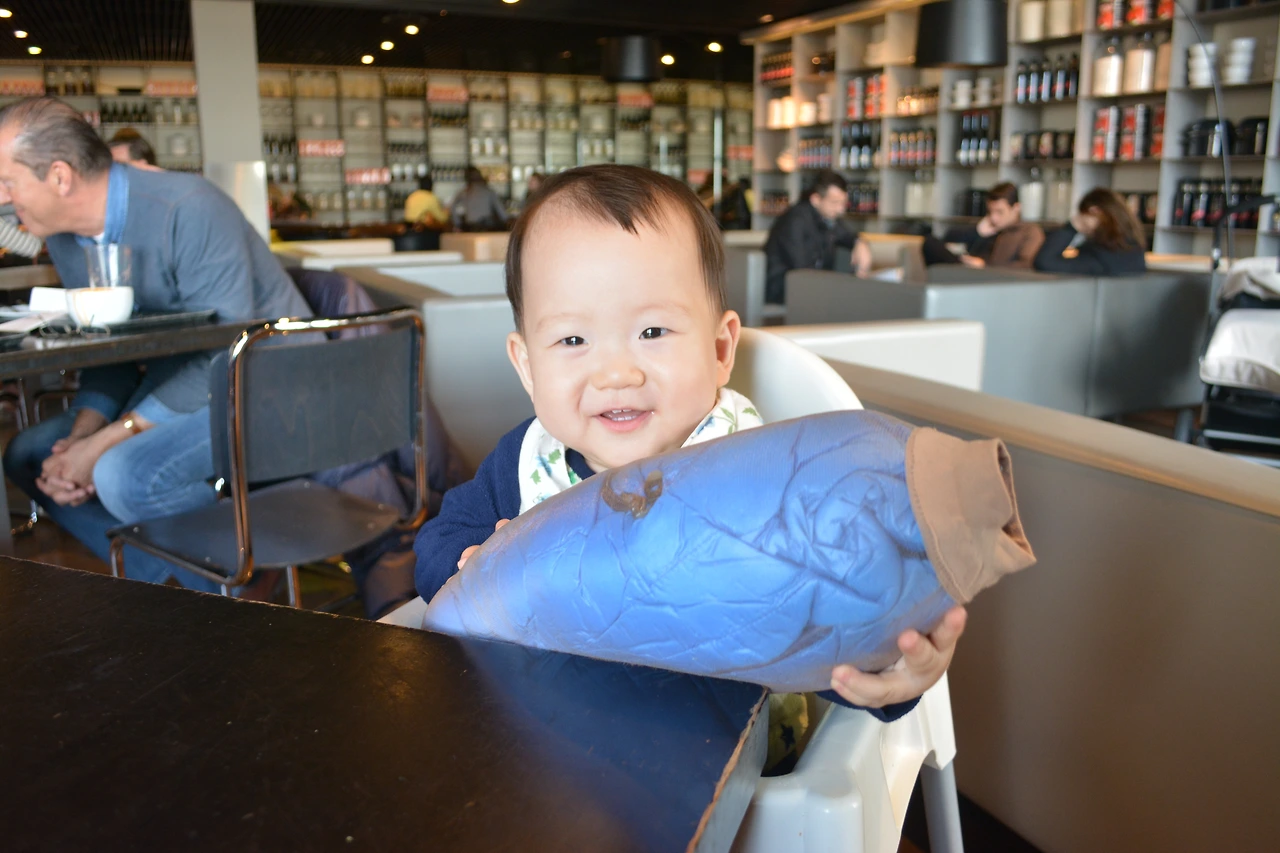 인천에서 밤 12시가 넘어 출발하는 밤 비행기라 율은 아기띠에 잠들어 안긴 채로 인생 첫 비행기에 탑승을 했다. 그런데 어쩐 일인지 베시넷에 눕히기만 하면 깨어났다. 깨면 달래서 다시 재우고, 다시 눕히다 또 깨면 처음부터 달래고... 연속 두 번 정도 깨어나자 세 번째부터는 아예 겁이 나서 눕힐 엄두가 나지 않았다. 그때부터는 아이가 잠들어 있는 그대로 안은채, 앉은 자세로 계속 비행을 이어 갔다. 혹시나 잠든 승객들에게 방해가 될까 봐, 잠깐 칭얼대기라도 하면 수유를 해가며 잠자는 시간을 연장시켰다. 그렇게 7시간 넘게 밥도 화장실도 포기한 채 안고 있었더니 아이는 아침에 일어나듯 개운하게 눈을 떴다. 역시 잘 자고 일어나더니 컨디션이 아주 좋았다. 남은 비행시간 동안은 베시넷에 앉아 장난감을 가지고 놀기도 하고 옆의 승객들과 눈을 마주치기도 하며 즐겼다.