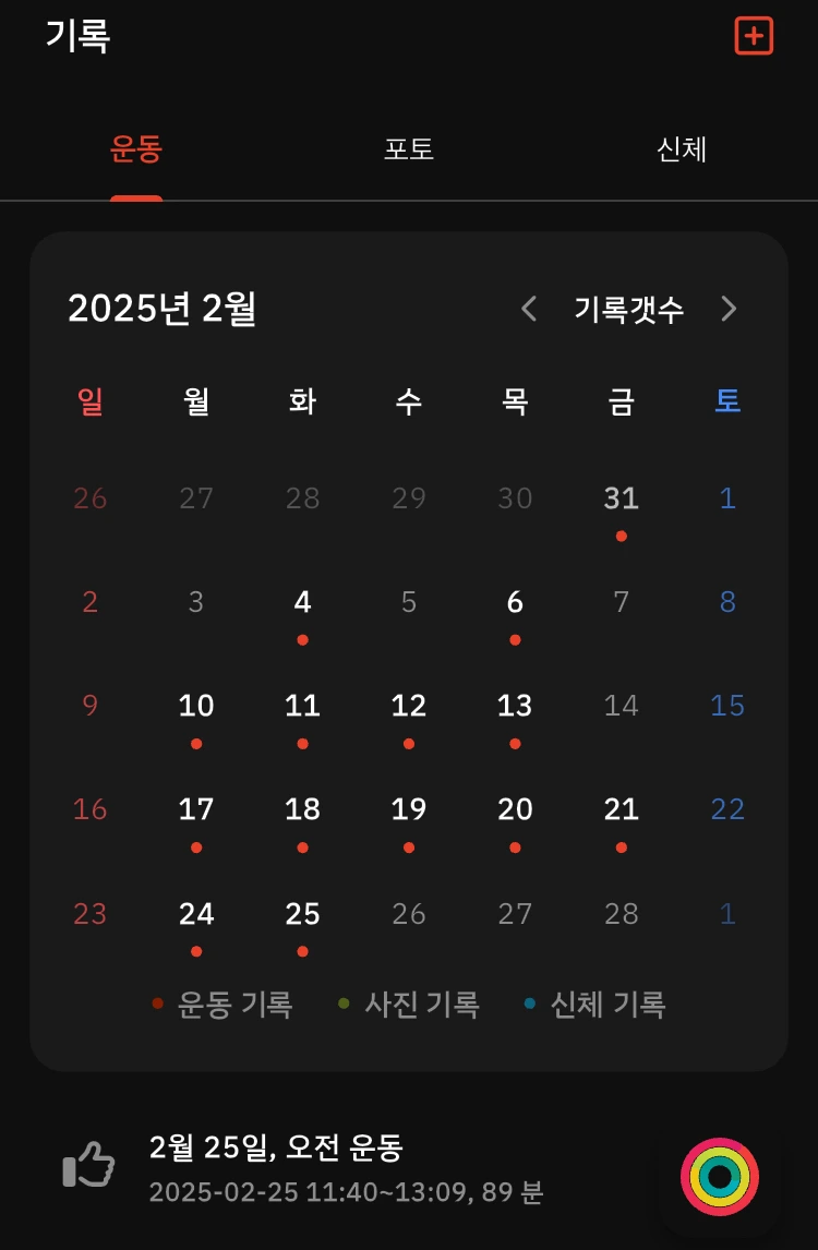 위 사진은 운동 어플로 기록한 제 운동 기록입니다. 그리고 빨간 점이 운동을 한 날입니다.