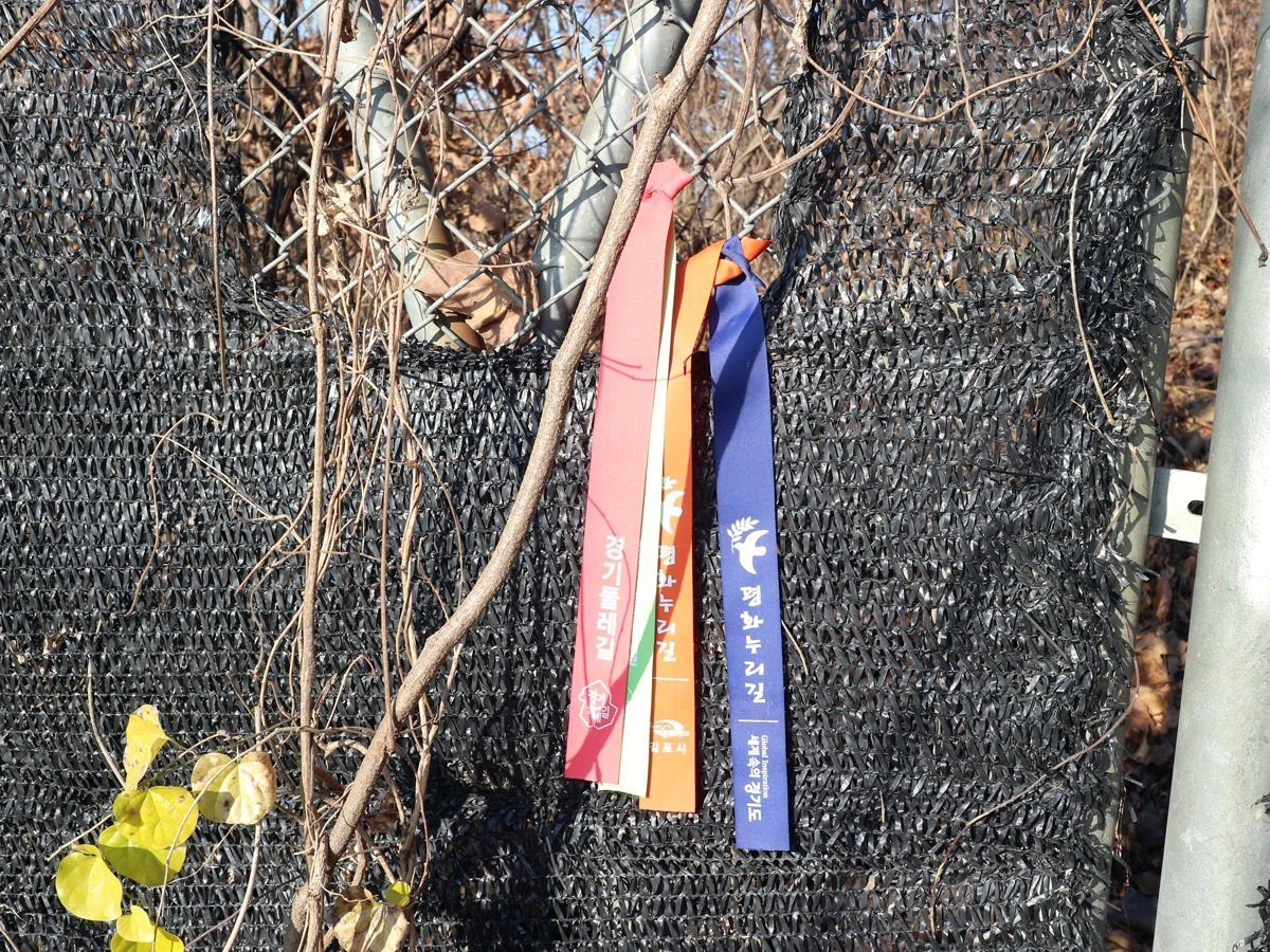 경기둘레길 1코스의 길이는 13.5km, 예정소요시간은 4시간, 난이도는 하. 대명항에서 출발해 문수산성 입구까지 이어지는 길이다. 대부분의 길이 바다를 따라 이어진다. 서해 바다를 보면서 차분하게 걸을 수 있는 길이다. 그 길에 철책이 길게 바다를 따라 쳐져 있다. 철책 사이로 바다가 보이고, 바닷새들이 보인다. 그 철책을 따라 다양한 프로젝트가 시행되었던 흔적도 남아 있다. 사람들은 이 철책을 바라보면서 평화를 염원하는 마음을 다지고 또 다지게 되는 모양이다.