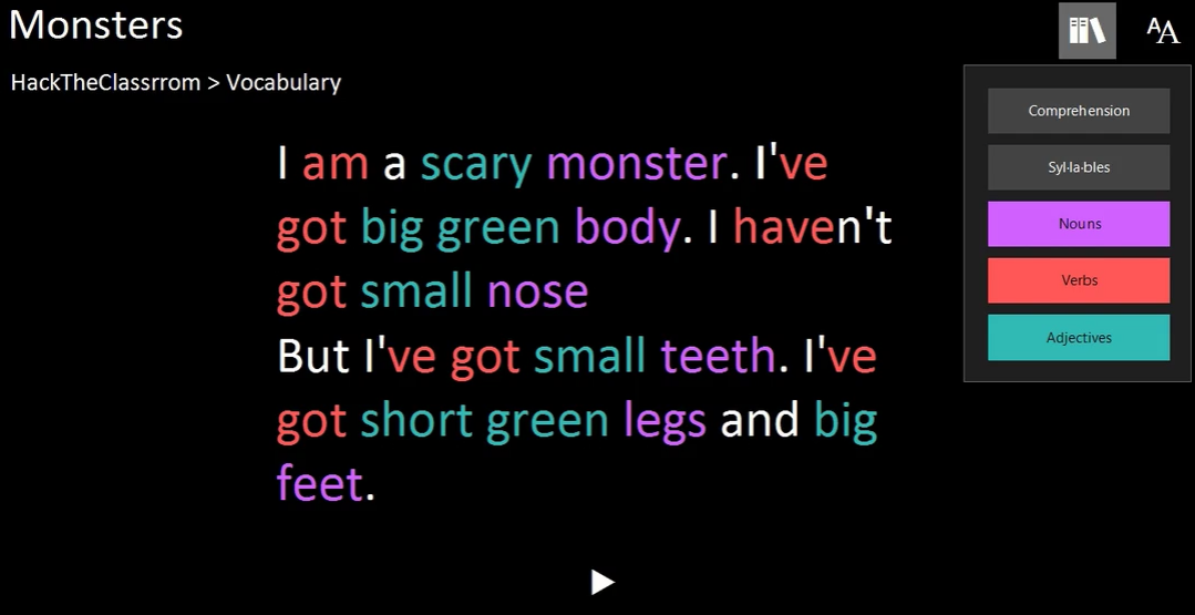 1) 텍스트를 소리 내어 읽어 주는 도구로서, 텍스트를 음절로 나누고 줄과 문자 사이의 간격을 늘려줍니다.
