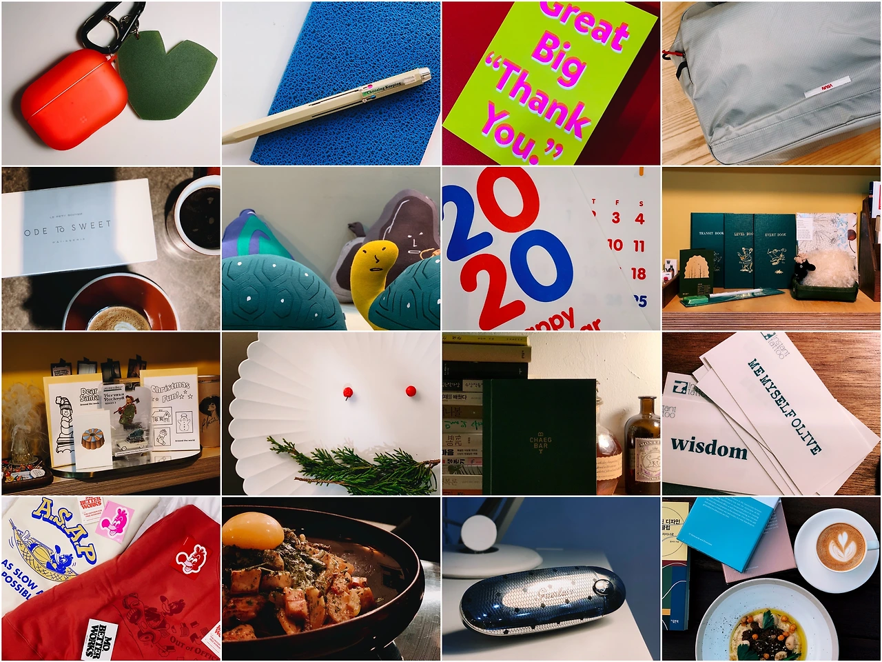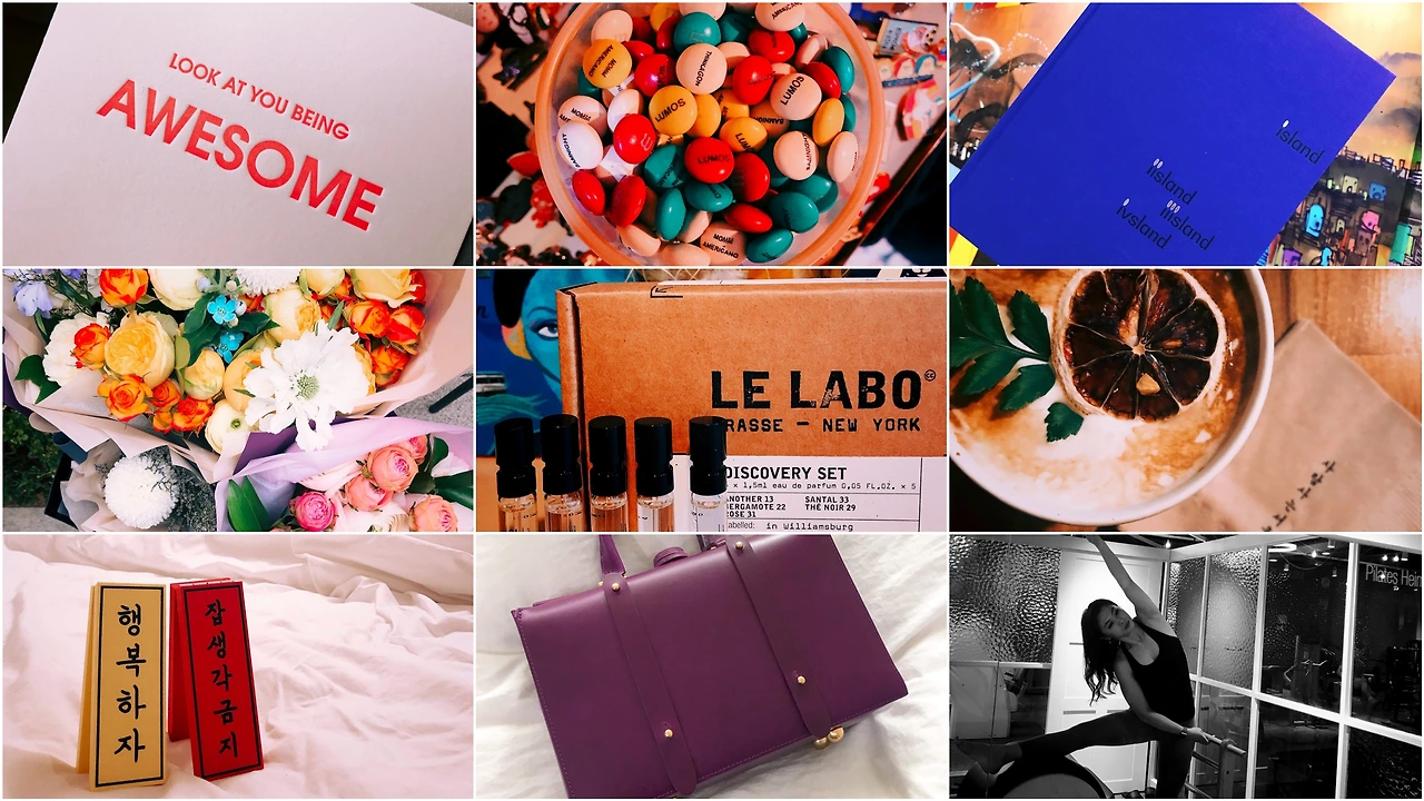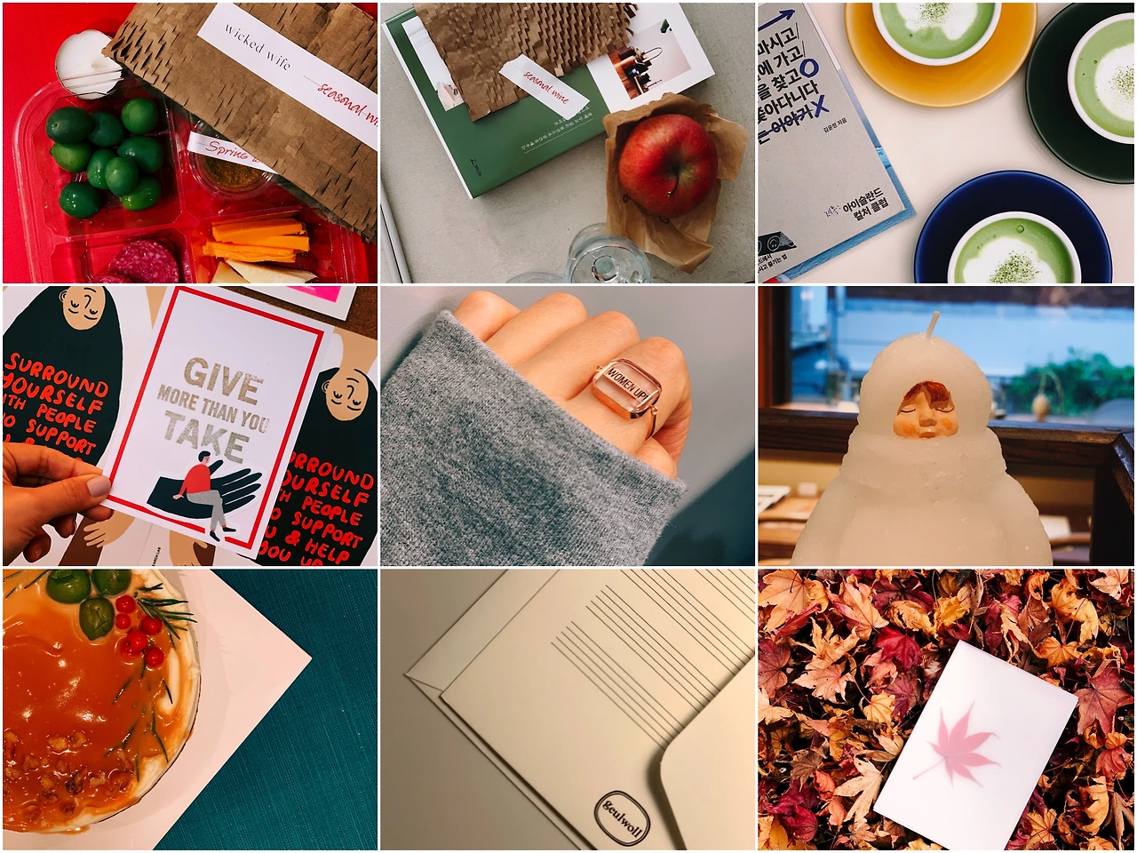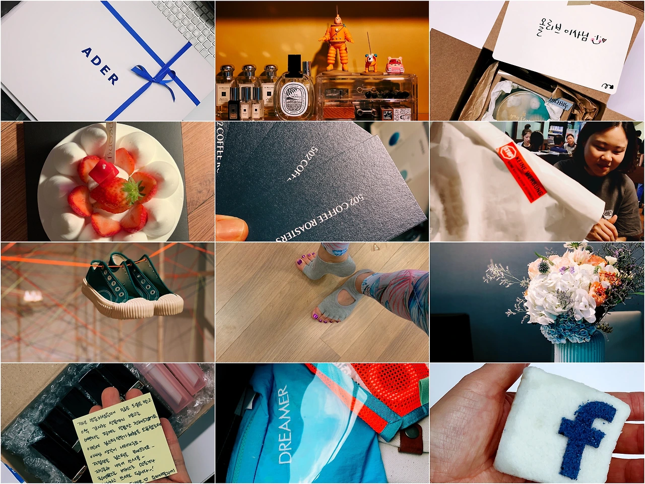 마음 다해 애써주신 인스타그램 데이 때 모신 모든 브랜드분들. 몇시간동안 작품을 하나하나 작업해 주신 오마치 작가님. 숭이 건네준 손에 착 감기는 헤비츠 가죽 필통. 귀염뽀짝 오뚜기 굿즈, 함께 해준 마이마이 타임, 스승의 날이라고 잔뜩 전해준 그대들의 뜨거운 마음들. 우리의 마음을 달래준 성수동 외출. 에너지 넘치는 을지장. 영감노트. 예쁜 손길 그대로 담긴 이 멋진 운동화. 꽃을 보듯 너를 본다는 시글귀와 꽃.