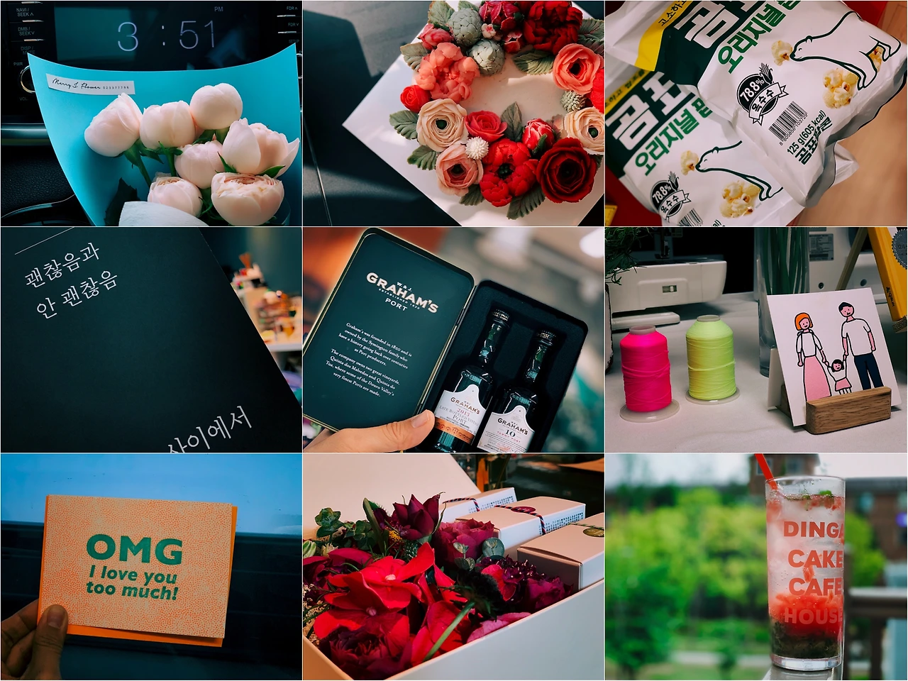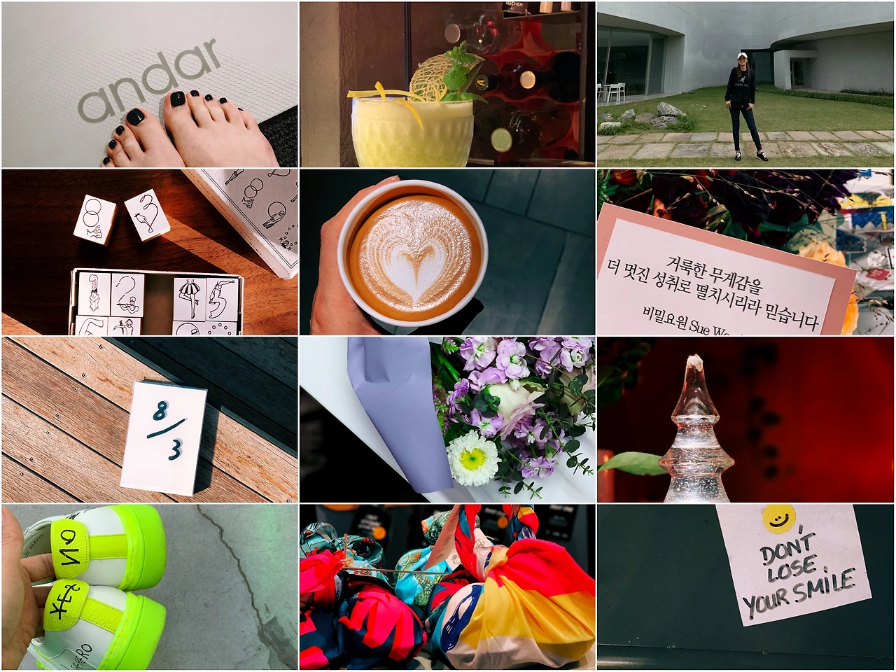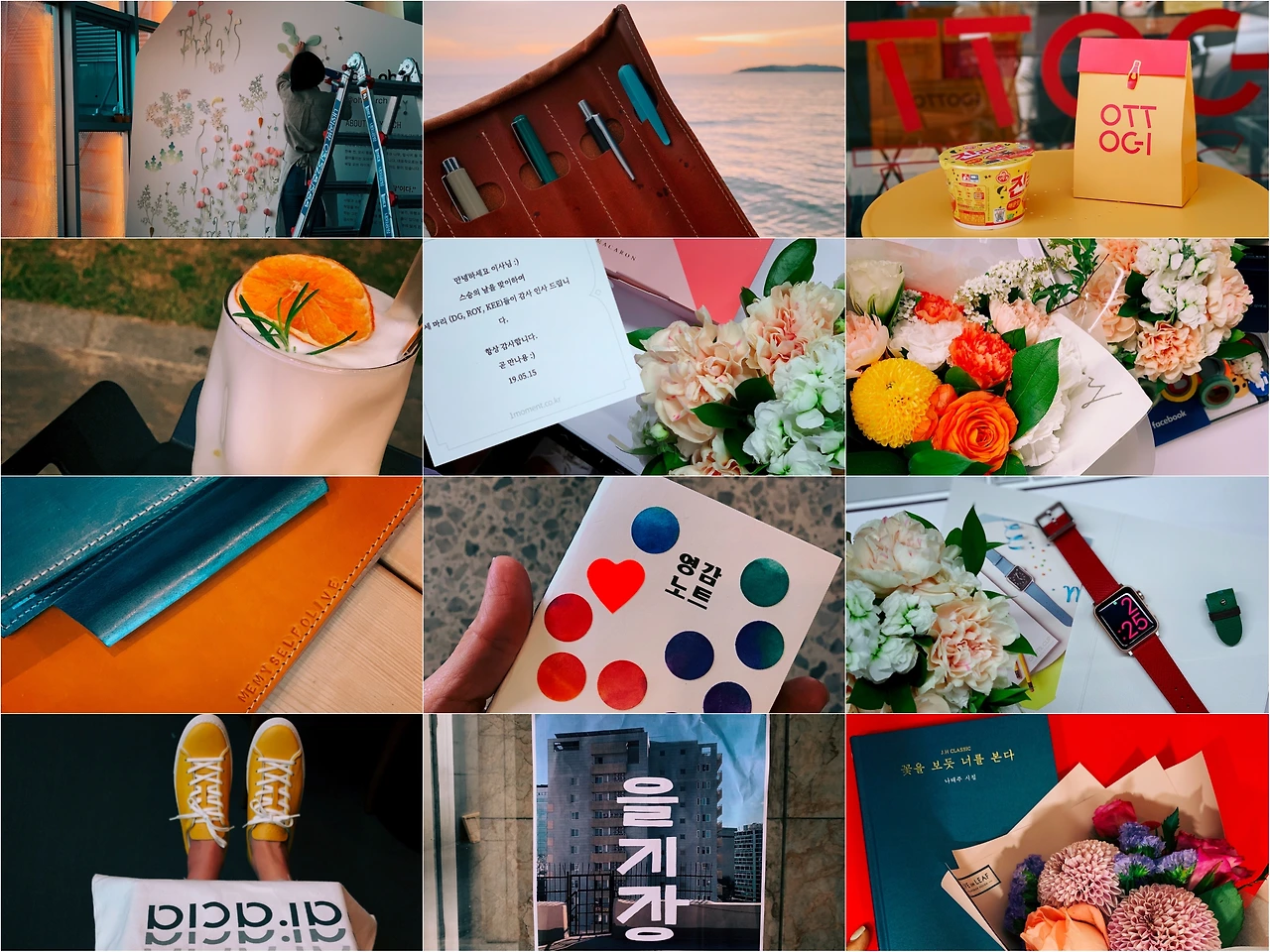 안다르 요가 세션, 연남동 바이브, 마이마이 짧은 휴식의 시간. 예쁜 도장 세트, 아침을 시작하는 오공이의 플랫화이트. 마음 속까지 든든하게 응원받은 기분의 꽃배달. 내 생일 날짜의 썬태닝 노트. 한남동 나들이. 그리고 기분 좋은 휴식을 선물하고 싶었던 순간.