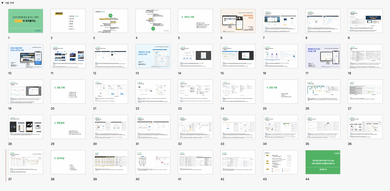 검색을 해보면 디자이너 포트폴리오는 많아도 '서비스 기획자 포트폴리오'는 자료가 많지 않다. 나도 처음에 포트폴리오를 작성하려고 할 때 막막해서 검색해보니, 어떤 분들은 'UX 디자이너 포트폴리오'처럼 분석부터 프로토타입까지로 프로젝트를 구분하여 작성한 것을 많이 보았다. 그런데 생각해보면, 나는 인하우스 서비스 기획자다 보니 어떤 프로젝트를 분석부터 구축까지 할 때도 있었지만, 중간 중간 운영 기획도 하는 경우가 대부분이었다. 그래서 이렇게 A~Z까지 나눠서 하나씩 프로젝트를 구분하려 하면 내가 한 일에 비해, 적을 것이 별로없는거다.