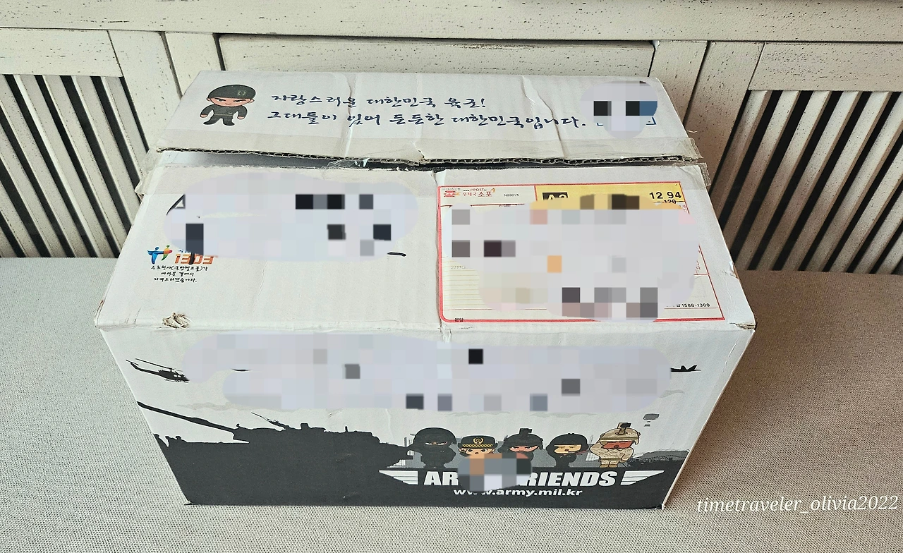 ‘자랑스러운 대한민국 육군! 그대들이 있어 든든한 대한민국입니다’라는 글귀가 상자 겉면에 적혀있다.