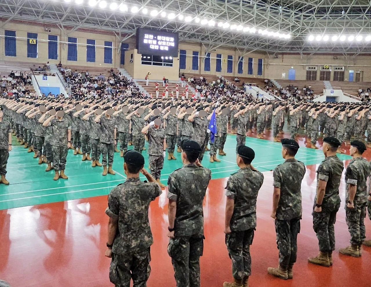 그런데 잠시 후, 갑자기 행사장 문이 열리고 군복 입은 아들들이 줄지어 밖으로 나왔다.