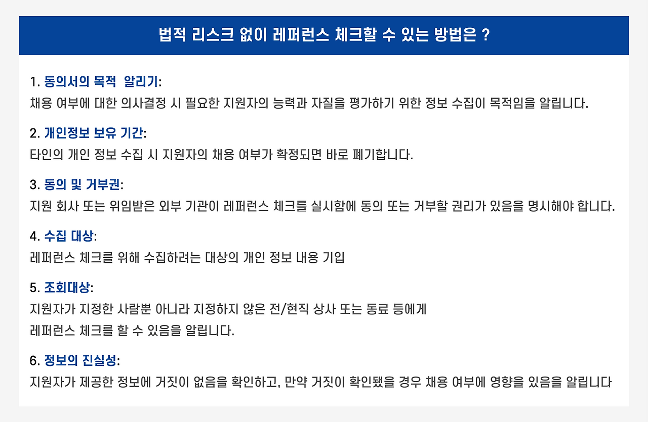 이를 해결하기 위한 방법 중 하나로, 많은 회사에서 최종 합격 여부를 결정하기 전에 평판조회(Reference Check, 이하 평판조회)를 진행하고 있습니다.