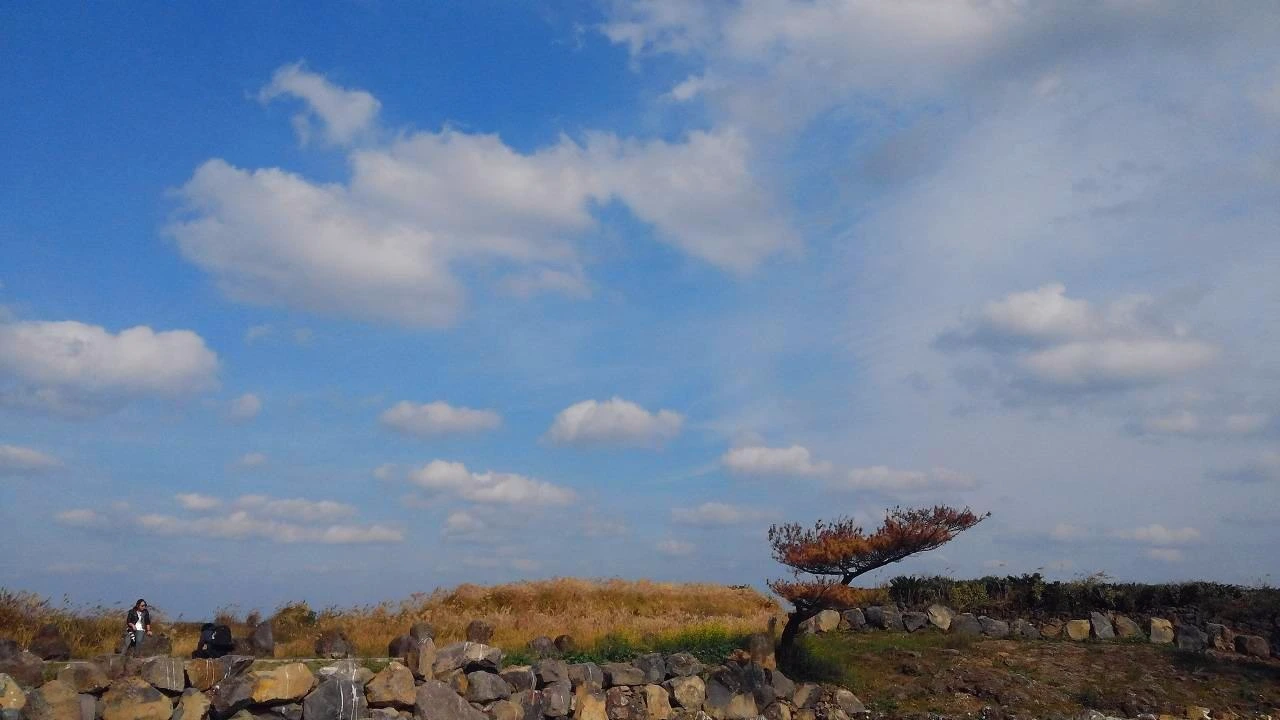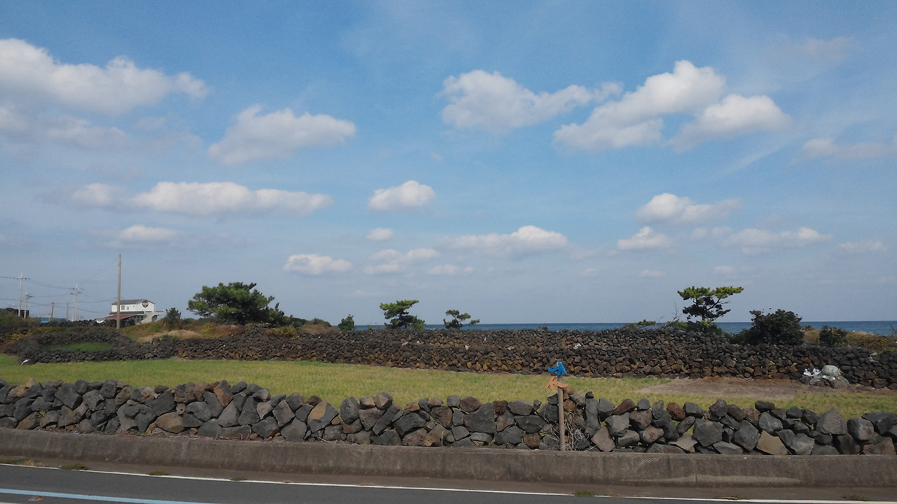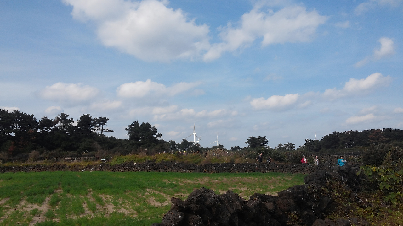 제주의 돌담을 보면 항상 궁금한 것이 있습니다. 저 돌담을 쌓은 사람은 분명 예술가 아니면, 미적 감각이 풍부한 사람이 아닌가 하고요. 이유는 돌담과 어우러진 밭들과 하늘색의 조화가 너무 멋져서입니다. 멀리 바람개비 날개도 한몫을 하네요. 설마 이 모든 것이 정말로 의도한 것은 아니겠죠. 그처럼 제주는 아름답습니다. 그 속에서 사람들은 길을 걷고 그 아름다운 풍경 속의 하나가 됩니다. 걷는 이들은 자신이 아름다운 풍경이 된다는 것을 모를 겁니다. 하지만 먼발치에서 바라보는 저의 눈에는 더없이 멋지고 평화롭게 보입니다. 그렇듯 열심히 일하고, 치열하게 세상을 마주하며 사는 사람들의 모습 또한 그 누군가에겐 아름답게 보일 것입니다. 그렇기에 우리 모두는 아름다운 삶을 살고 있는 것입니다. 하지만 때로는 지루하거나 힘들 때도 있습니다. 그럴 땐 지금처럼 고개를 들어 하늘을 바라보아도 좋을 것 같습니다. 그곳엔 세상을 품고 있는 눈이 부실만큼 새 파란 하늘이 있으니까요.