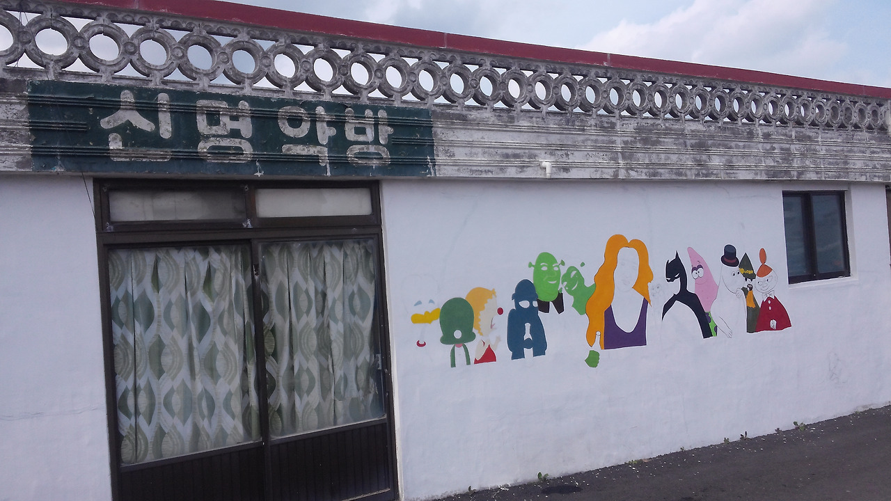 작은 동네에 들어섭니다. 약방이 보이네요. 벽에는 금방이라도 튀어나올 것처럼 동심이 가득한 친구들이 그려져 있습니다. 약방 이름을 보니 신기한 명약이 있는 약방인 것 같습니다. 검은 밤. 병원이 있는 먼 도시로 가기 힘들 때면 어르신들은 이곳 작은 약방에서 약을 드시며 속을 다스리셨을 겁니다. 아마도 약방 주인은 누구네 누구네 집 어르신은 어디가 불편하신지 모두 알고 있을 것입니다. 그렇기에 약방은 이곳 작은 마을을 떠나지 못하고 지금까지 이곳에 있을지도 모르겠습니다. 모든 분들이 신명 나는 삶을 사셨으면 좋겠습니다. 그 옆엔 조그마한 구멍가게도 보입니다. 언뜻 보면 아무도 없는 것 같지만 문을 열고 들어가면 안쪽 방에서 마실 나오신 제주 할망들이 이야기를 나누고 계십니다. 올레 축제를 하는지 모르고 계셨나 봅니다. 웅성웅성 사람들이 지나가는 것을 보시곤 깜짝 놀라 십니다. 적막했던 마을에 많은 사람들이 지나니 활기가 도는 것 같습니다.