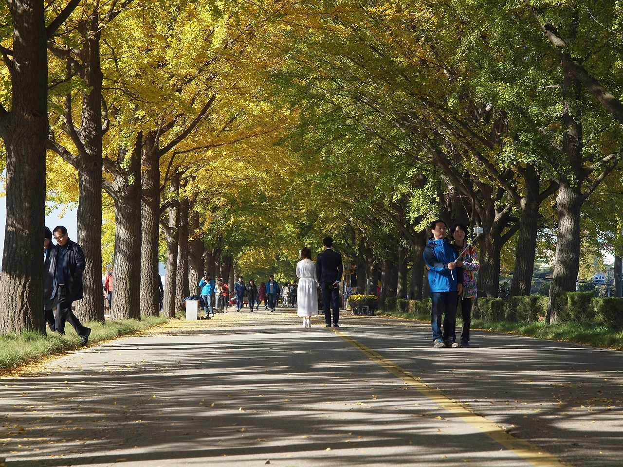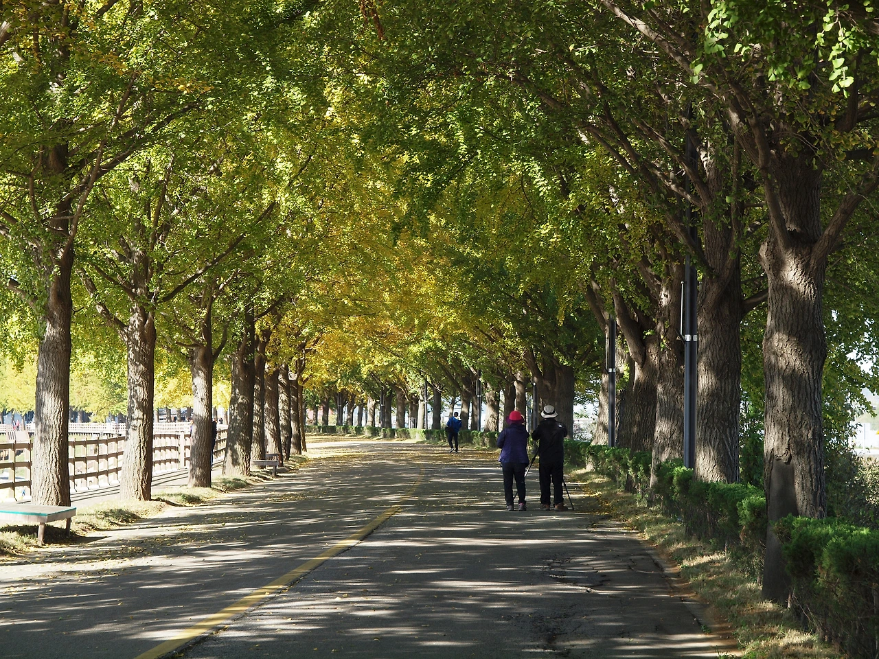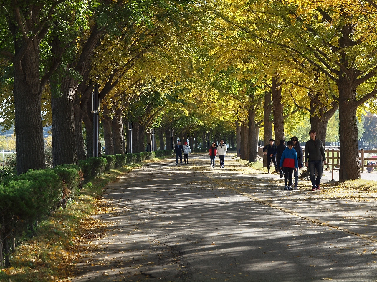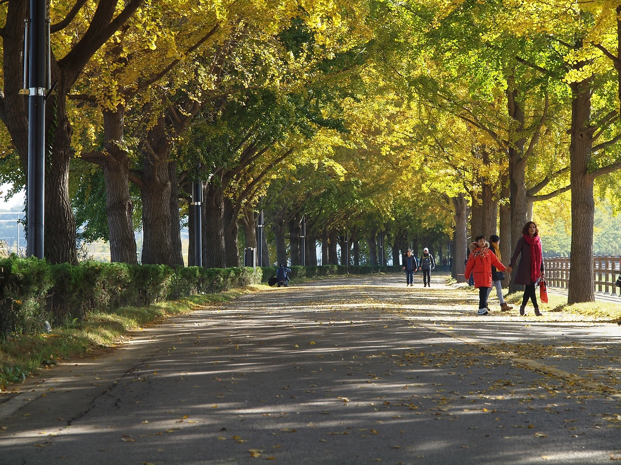 차가왔던 아침 공기는 시간이 지날수록 점점 더 따뜻해지고 있습니다. 노란 터널에는 이전보다 더 많은 사람들이 길을 걷고 있습니다. 사람들은 여전히 여유롭습니다. 햇살이 따스했던 이 킬로 남짓한 은행나무 길 위에선 사람들의 다양한 삶을 볼 수 있었습니다. 그들과 직접 얘기해 본 것은 아니었지만 사람들은 아름다운 길을 걸으며 여유와 함께 복잡하고 힘들었던 삶의 무게를 잠시나마 내려놓는 듯 보였습니다. 그것은 누구나 받을 수 있는 가을의 공평한 선물이었고, 사람들은 그것에 감사하며 길을 걷습니다. 그렇게 그들은 이 가을 또 하나의 추억을 만들고 있었습니다.