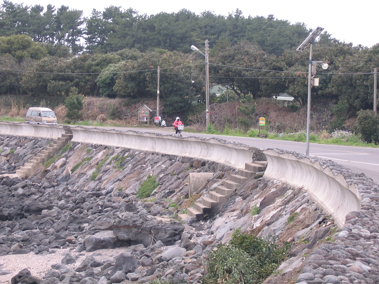 어디선가 가늘고 길게 '삐~~~' 하는 소리와 노랫소리가 들렸다. 좀 전에 지나간 군인들의 호루라기 소리인가 했는데, 저 멀리 빨간 점퍼에 얼굴을 가리는 깊은 모자를 쓴 아주머니가 자전거를 타고 오고 있었다. 의문의 소리는 자전거에서 나는 소리였고, 노랫소리는 그 아주머니가 부르는 노랫소리였다. 물질을 마치고 집으로 돌아가는 뿌듯함. 그래서 노래가 저절로 나올 만큼 보람찬 그녀의 삶. 참 소중한 장면이었다.