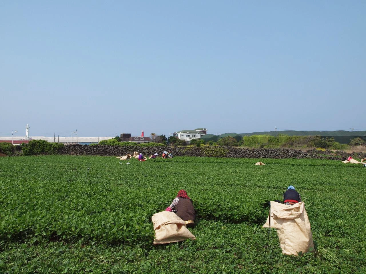 결국 애월에 도착해서야 늦은 점심을 먹었다. 배를 채운 후 힘을 내어 걷다 보니 초록이 가득한 밭이 보였다. 일을 하시던 아주머니 한분이 손을 흔들어 주셨다. 사진으로 그 모습을 담고는 밭에서 자라는 것이 무엇이냐고 물어보았다. 취나물이란다. 뜻밖이었다. 난 취나물이 산에서만 나는 줄 알았는데 밭에서 재배가 되고 있다니. 지나던 사람들도 신기해했다. 아주머니들은 취나물을 뿌리째 뽑지 않고 위쪽만 잘라 내고 계셨다. 며칠이 지나면 또다시 싹이 나기 때문이라고 한다.