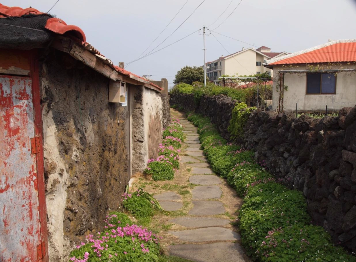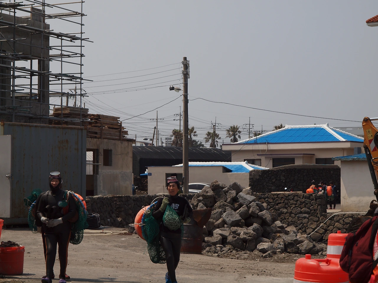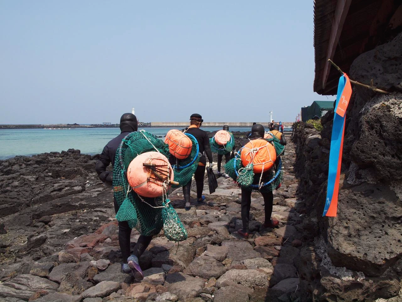 어디선가 사람들의 웃음소리가 들려왔다. 소리들은 어느 마을 회관 앞에서 들려오고 있었다. 그곳엔 물질을 준비 중인 해녀 할망들이 계셨다. 조용한 동네에 많은 사람들이 지나는 것을 보시곤 왠지 마음이 들뜨신 것 같았다. 잠시 무거운 물질도구를 메고 바다로 나가는 해녀 할망들과 함께 길을 걸었다. 말씀을 건네니 친절하게 받아 주시며 어디서 왔는지, 오늘 몇 명이 이 길을 걷는지, 다리는 아프지 않은지를 물어보셨다.