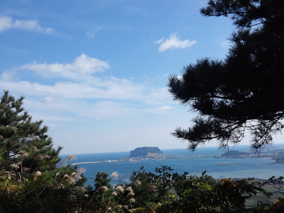 그 소리에 "뭔가 있구나" 하는 생각으로 힘을 내어 좀 더 오르니 좀 전까지 힘들어했던 사람들이 한 곳을 바라보며 모두들 입가에 미소를 띠고 있다. 다가가 보니 아직 정상도 아닌데 나무들 사이로 보이는 성산 일출봉의 풍경을 바라보며 감탄을 하고 있다. 여기가 이 정도니 정상에서는 더 큰 무엇이 있을 거란 기대가 차 오른다. 그렇게 달콤한 애피타이저 같은 풍경은, 바람 빠진 자전거 바퀴에 바람을 채우듯, 나와 그곳에 있던 사람들의 두 다리에 힘을 불어넣어 주었고, 사람들은 그 힘을 실어 얼마 남지 않은 길을 재촉한다. 이젠 점점 정상이 가까워 오는 듯하다. 사람들의 감탄 소리와 웃음소리가 점점 크게 들려온다.