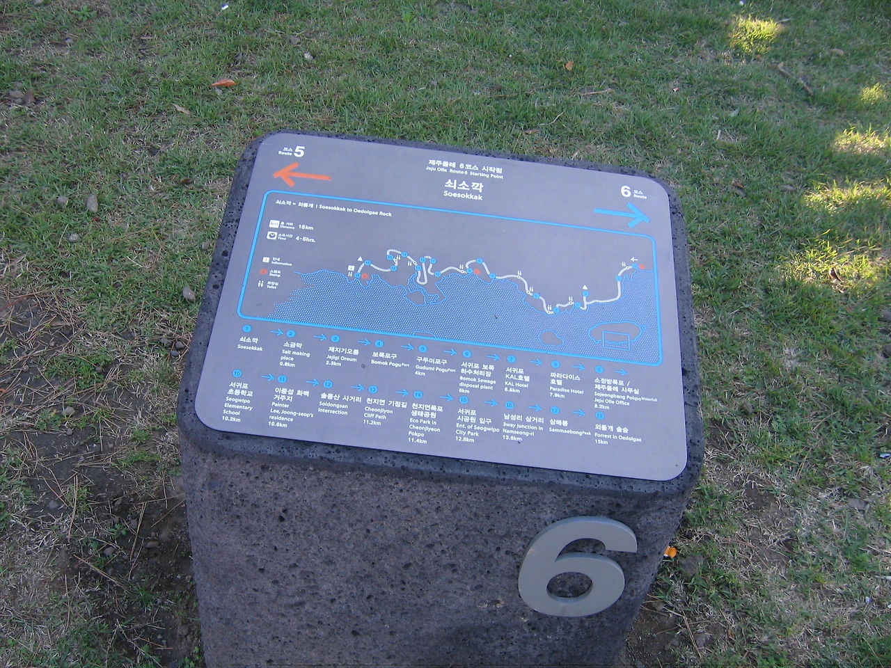잘 꾸며진 칠십리공원을 지나니 외돌개로 가는 푯말이 보인다. 종착지의 이정표를 보며 “도착이 얼마 남지 않았구나” 하는 마음과 함께 긴장감이 사라지며 다리가 조금씩 풀릴 때쯤, 올레 리본은 여정이 얼마 남지 않음이 아쉬웠는지 삼매봉 입구로 방향을 가리킨다.