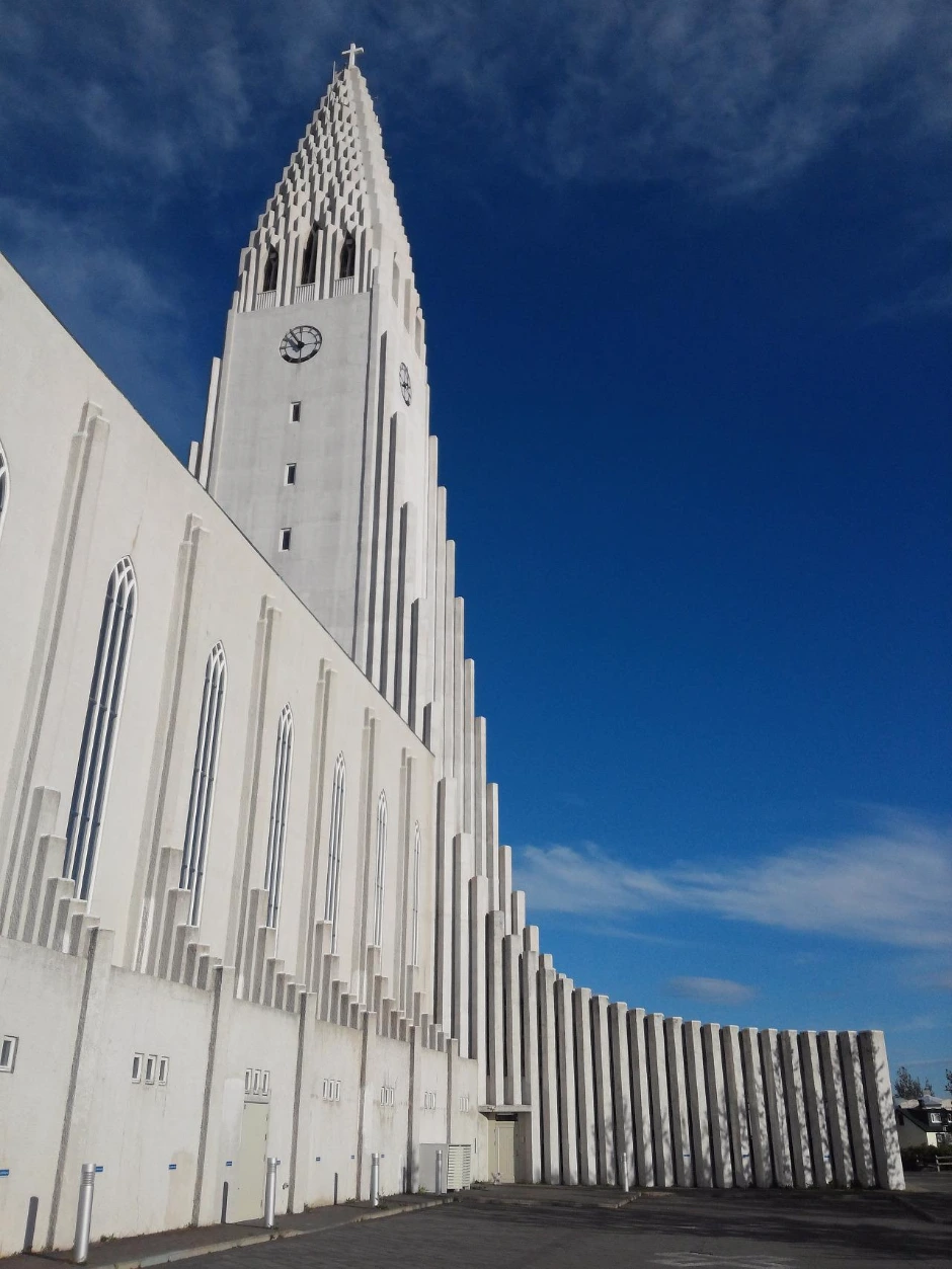 숙소에 도착 후 자는 둥 마는 둥 잠깐 눈을 붙이고 비몽사몽 일어나 조식을 먹으려 본관식당으로 가기 위해 밖으로 나오니 커다란 탑이 눈에 들어온다. 자세히 보니 탑이 아니고 건물이다. 현무암을 이용하여 지은 건축물로 완성하는데 무려 35년이 걸린 1986년에 완공되어 죽기 전에 꼭 봐야 하는 건축물 리스트에 있는 '할그림스키르캬' 교회이다. 몇백 년을 간직한 유럽의 오래된 교회와는 달리 역사는 짧지만 이곳 사람들한테는 큰 상징적 의미가 있는 건물이다. 용암이 흘러내리는 주상절리 모양으로 지어져 레이캬비크의 랜드마크로서 내부는 일반 교회와 크게 다르지 않다. 교회로 들어가면 건물 꼭대기에서 레이캬비크의 시내를 바라볼 수 있는 전망대로 가기 위한 엘리베이터가 있다. 애석하게도 내가 갔을 때에는 내부 사정으로 운행을 하지 않았다.