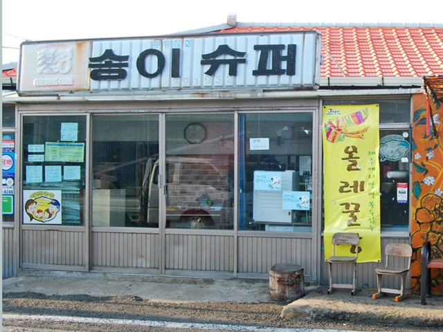 8코스를 시작하는 월평리에는 길을 걷기 전 대부분의 올레꾼들이 들르게 되는 조그만 가게가 있다. 올레길 시작점에 있는 ‘송이 슈퍼’이다. 많은 사람들이 찾아오는 유명한 관광지처럼 특별한 무엇이 있는 곳은 아니지만 ‘송이 슈퍼’라는 문구와 지금은 없어진 옛날 전화번호가 흐릿하게 적힌 낡은 간판이 왠지 낯설지 않고 친근하게 느껴진다. 그래서 이곳에 올 때마다 굳이 필요하지 않아도 초콜릿을 사든 음료수를 사든 무언가를 사기 위해 들르곤 한다. 가정집 느낌이 드는 가게 안은 작은 가판대 위에 단촐하게 물건들이 진열되어 있어 도심에서는 느낄 수 없는 정겨움이 있다. '송이'는 이집 주인의 따님일 것이라고 예상은 하지만 확인된 바는 없다. 예전에는 7코스 종점과 8코스 시작 스탬프를 관리해 주었던 고마운 슈퍼이다.