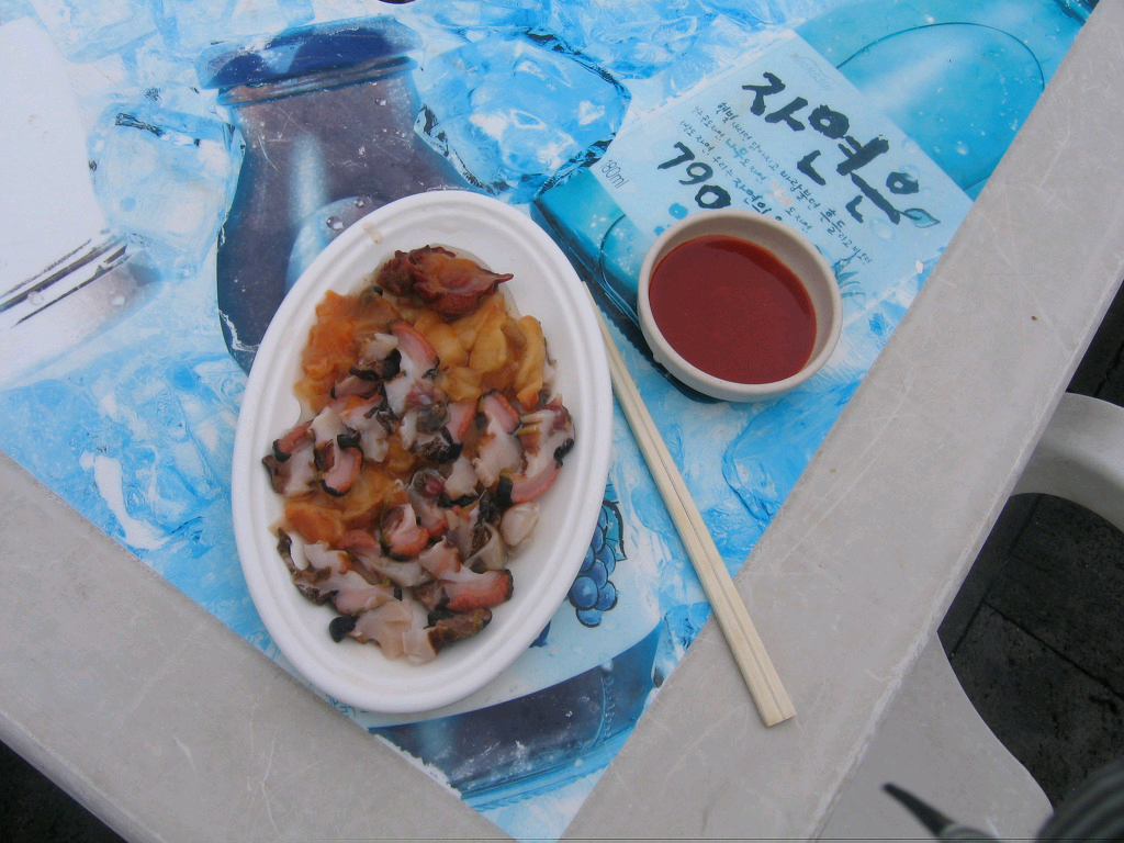 오름을 돌아 다시 입구로 오면 길은 중문 색달 해변으로 이어진다. 터벅터벅 걷다 보니 해녀 할머니들이 직접 바다에서 채취한 해산물을 파는 곳이 나온다. 멍게와 해삼 한 접시를 할머니께 달라고 하니 혼자 왔냐고 물어보시곤 대평리까지 가냐고 물어보신다. 많은 올레꾼들을 만나시다 보니 8코스 끝이 어디인지 아시는 것 같다. 그리고 혼자 걷는 것이 쓸쓸해 보였는지 다음에는 꼭 둘이 오라 하신다. '네~~' 하고 웃으며 대답하고 다음에도 꼭 다시 오겠다고 말씀을 드렸더니 빙그레 웃으신다. 무뚝뚝하게 보였던 할머니의 표정이 환하게 웃는 표정으로 바뀌셨다. 할머니의 웃음과 오고 가는 대화에서 다정하신 제주 할머니의 정이 느껴진다.