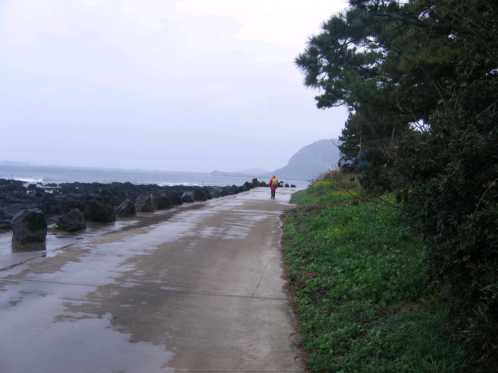 이제 길은 지그재그 갈지자로 이어져 가며 해안도로를 걷는다. 길 옆으로 정렬되어 있는 돌들을 보니 이 길을 만든 사람들의 노고가 보인다. 왼쪽으로는 등대가 있는 바다가 보이고 오른쪽으로는 멀리 한라산이 보인다. 그리고 콘크리트로 된 바닥에는 채 굳기도 전에 바다새가 총총총 걸어간 발자국이 남아 있다. 남겨진 자욱을 보니 바다새의 발에 아직 굳지 않은 콘크리트가 묻었을 것인데... 하늘 높이 잘 날아갈 수 있었는지 궁금하다.