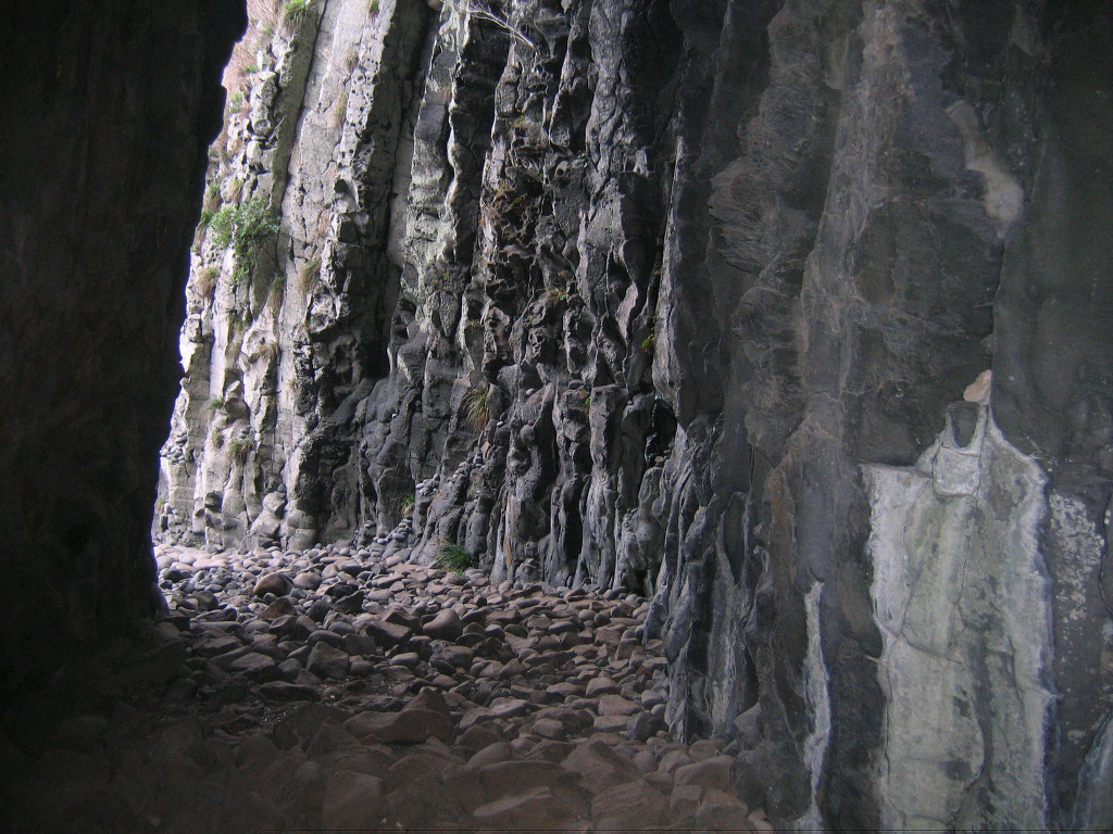 하얏트 호텔을 지나니 갯깍 주상절리대가 나온다. 아까 전에 멀리서만 보았던 주상절리의 절벽 밑으로 걷게 되는 것이다. 깎아지를 듯한 절벽의 압도적인 높이와 경사는 걷는 이의 마음을 조금은 두렵게 하지만 절경 앞에서 포기란 있을 수 없다. 발 디딜곳에 집중을 하며 울퉁불퉁한 바위 위를 걷다 보니 조그만 동굴 같은 곳이 나온다. 예전 노비를 쫓는 '추노'라는 프로의 촬영 장소이다. 동굴은 끝이 막혀 있는 것이 아니고 다시 바다 쪽으로 나갈 수 있도록 통로처럼 뚫려 있는 형태로 제주에서는 이런 굴을 '들렁궤'라고 부른다. 안으로 들어가보니 아늑한 느낌이 든다. 물이 나가는 입구에 앉아 바다를 보니 더욱 운치 있게 보인다. 이곳은 서귀포 향토 유산으로도 지정된 곳이기도 하다.