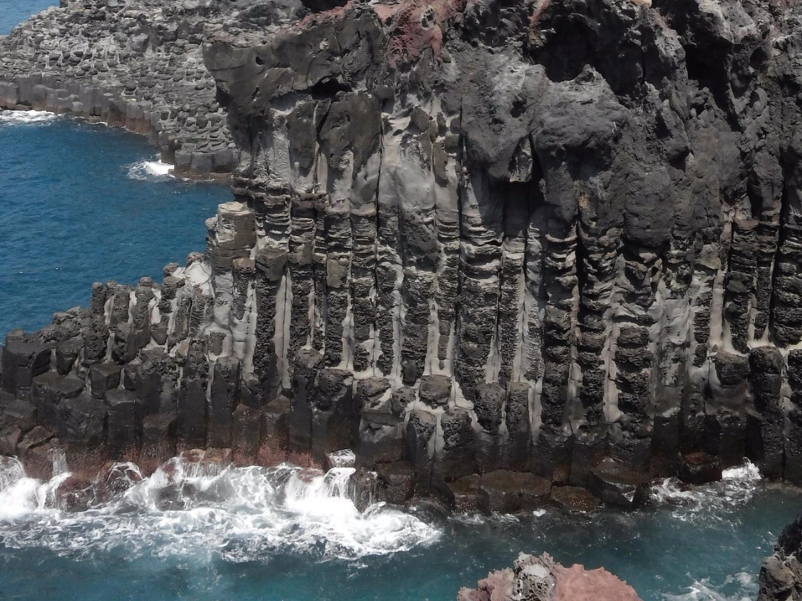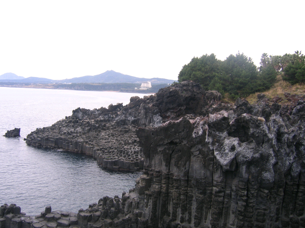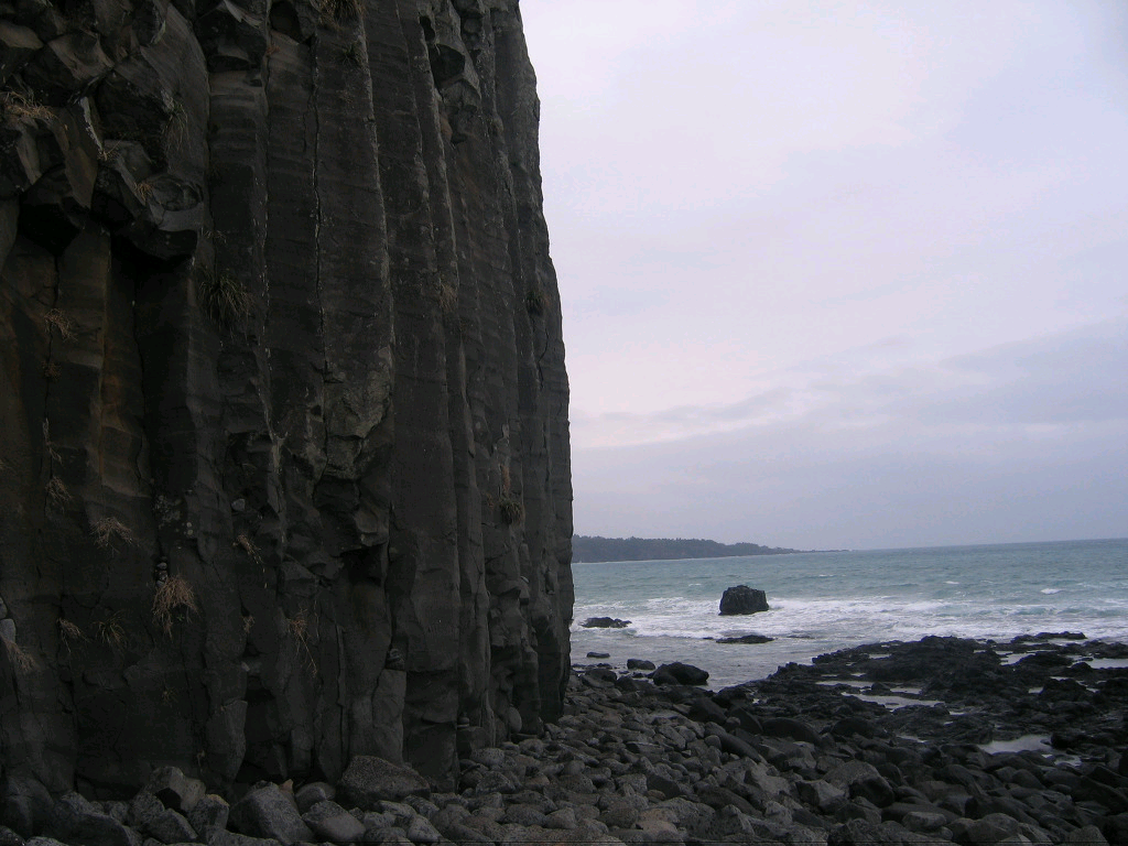 바다를 보며 올레 리본을 따라가니 제주의 유명 관광지인 '주상절리'가 나온다. 산골짜기에서 살다가 화려한 도심으로 나온 것처럼 지금까지의 한적했던 길과는 달리 많은 사람들로 북적이고 있다. 한국 사람보다는 중국 사람들이 더 많다. 그들도 주상절리의 모습이 많이 신기한가 보다. 모두들 사진을 찍느라 정신들이 없다. 얼떨결에 나도 어느 커플의 사진을 찍어 주었다. 주상절리는 지표로 분출한 용암이 식을 때 수축작용에 의해 생긴 수직의 돌기둥 모양으로 갈라진 틈이다. 가까이서 볼 수는 없지만 짓 푸른 바닷물이 주상절리와 부딪치며 하얀 물보라를 일으켜 멀리서 바라보는 풍경만으로도 자연적으로 만들어진 작품이 신기하고 아름답기만 하다. 올레길은 주상절리 밖으로 길을 안내하고 있기 때문에 주상절리를 보려면 매표를 하고 안으로 들어 가서 보아야 한다.
