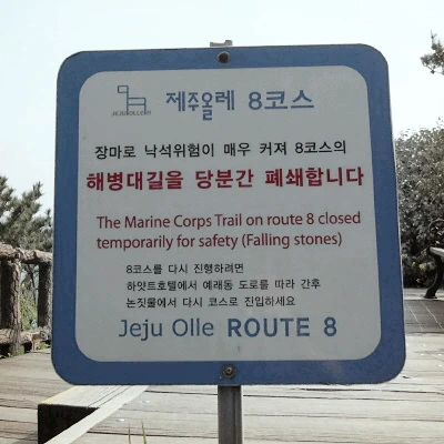 제주는 해마다 태풍의 영향을 많이 받는다. 그래서 태풍이 지나가고 나면 힘들게 개척하고 만들어 놓은 올레길 들이 망가 지곤 한다. 특히 바닷길을 걷는 구간에서는 바람과 파도에 휩쓸려 길들이 유실되고 사람들이 드나들 수 없게 돼버리곤 한다. 그래서 본래 8코스는 하얏트 호텔을 지나 갯깍 주상절리대와 해병대 길을 걷게 되어 있었으나 낙석의 위험이 있어 불가피하게 중문 관광단지로 우회하여 예래 생태 공원을 지나 본래 코스인 논짓물로 들어서게 된다. 그래서 갯깍 주상절리와 해병대 길은 지금은 통제가 되어 갈 수가 없는 길이다. 지금은 비록 갈 수 없는 길이 되었지만 예전에 걸었던 기억으로 적어 보려 한다.