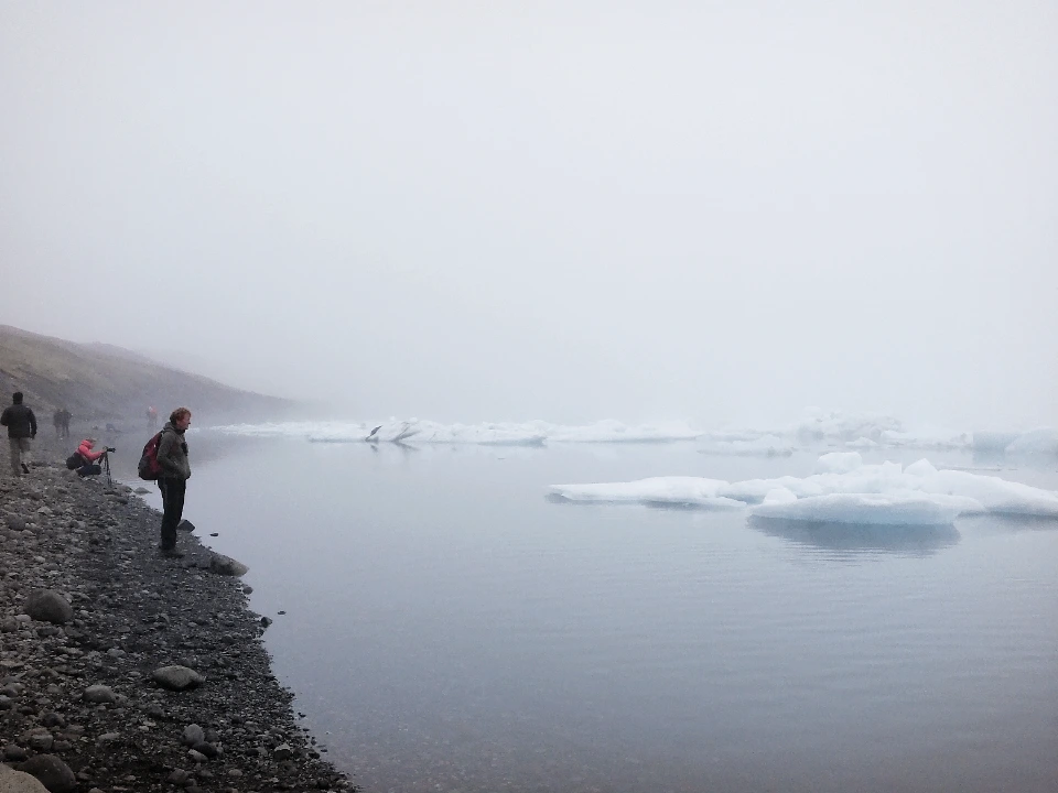난생처음 빙하가 떠내려오는 것을 보니 내가 지금 있는 곳이 어디인가? 하는 생각이 들며 지금 이곳에 내가 있다는 것이 신기하기도 하다. 빙하를 만져보니 푸른빛이 도는 것이 무척 투명하고 불순물이 전혀 없는 순수한 느낌이다. 크루징을 하면 좋았을 텐데 안개 때문에 빙하가 떠 내려가는 모습만을 보니 너무 안타깝다.