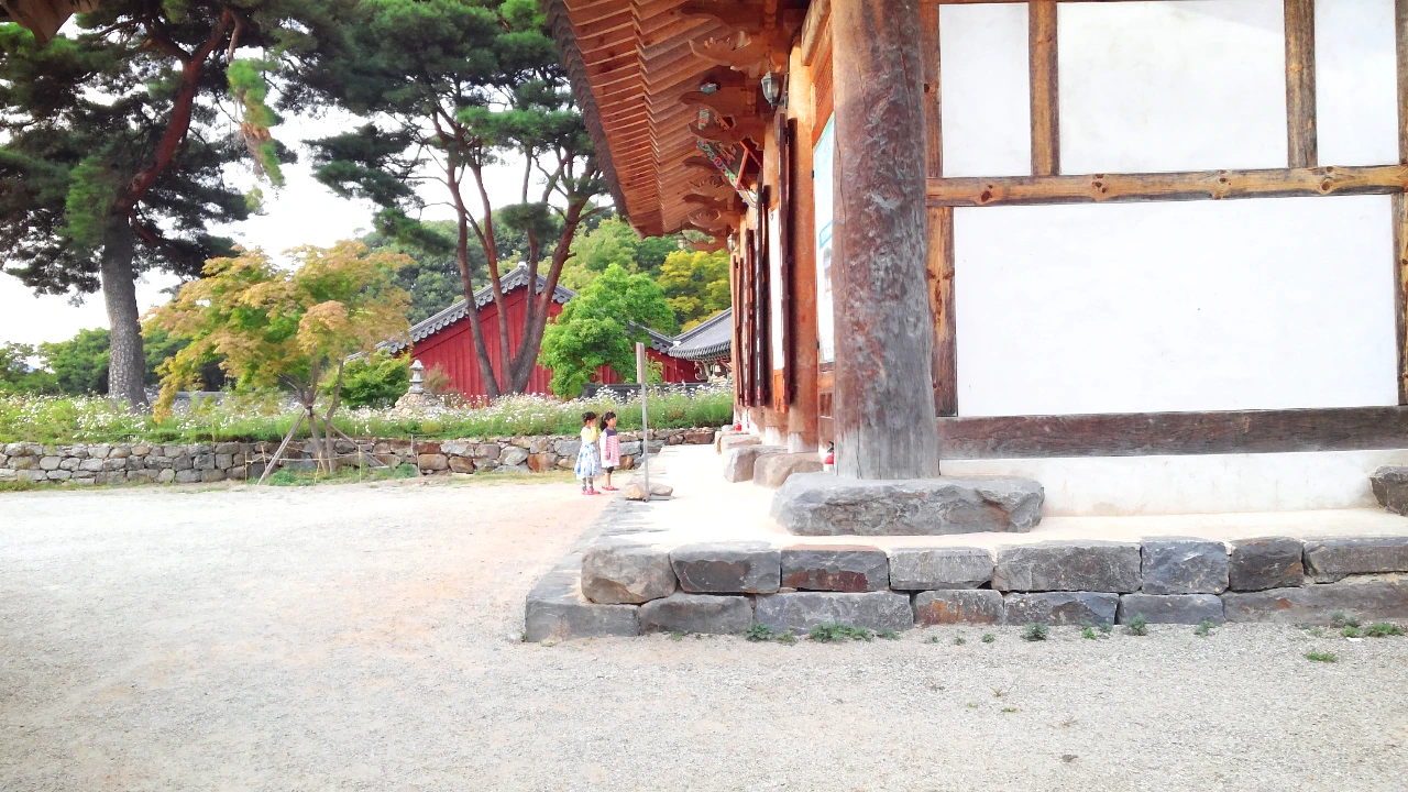 법당의 부처님을 호기심 어린 눈으로 바라보는
