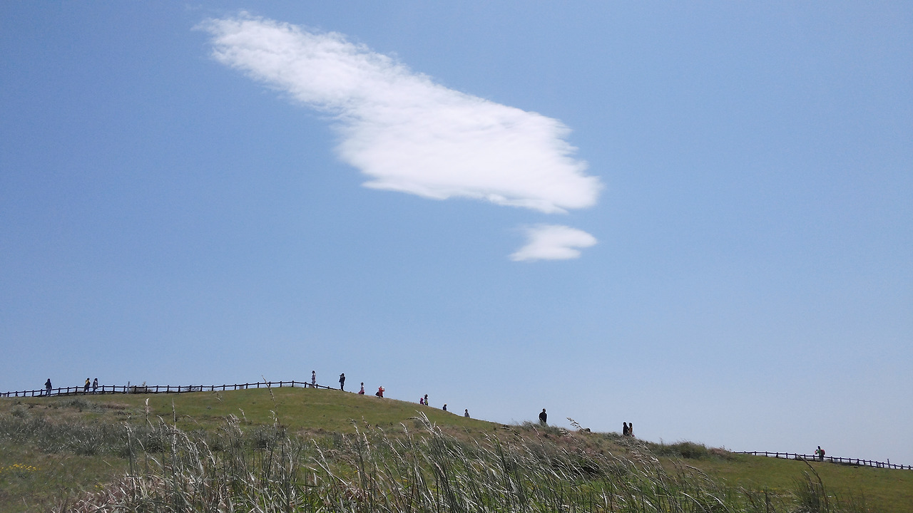 등대 박물관을 지나 올레 리본을 따라 내려가니 너른 평지와 작은 동산이 보인다. 평지에는 누렁소가 풀을 뜯고 있고 무덤들이 모여 있는 동산에는 말이 한가로이 봄의 여유를 느끼고 있다. 계속 올레 표시를 따라가다 보니 정상에서 이어진 우도봉의 능선이 보이고 그 능선을 따라 올라가는 사람들의 모습이 보인다. 아이를 안은 아빠, 두 손을 꼭 붙잡은 연인, 행복해 보이는 가족들, 멀리까지 웃음소리가 들려오는 함께 온 친구들의 모습들이 보인다. 그곳에서 멋진 풍경을 바라보는 사람들의 마음은 모두 똑같을 것이다. 나도 능선을 따라 오른다. 바람은 거세지만 멀리 보이는 풍경을 보며 아름다움에 감탄하느라 힘들 새가 없다.