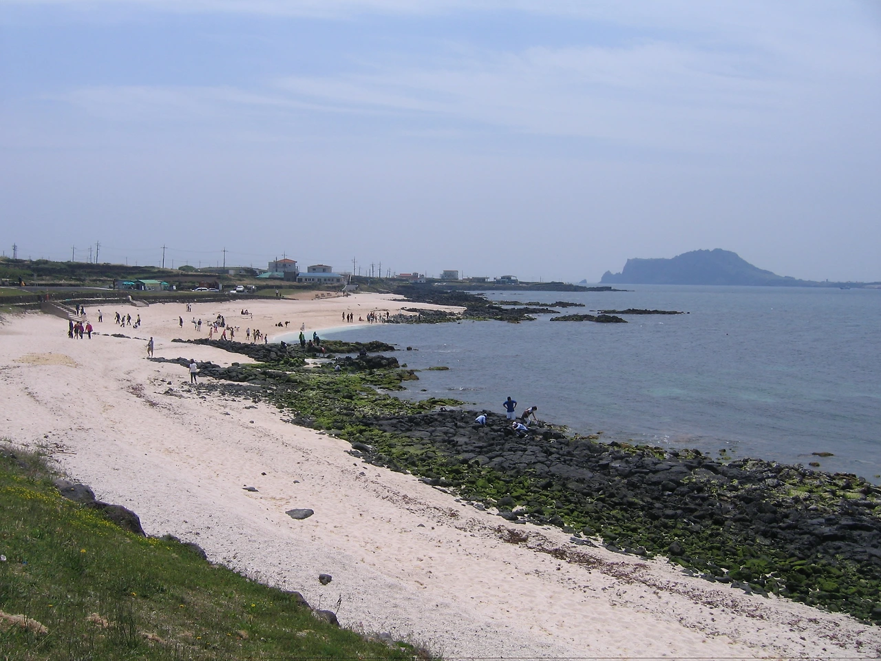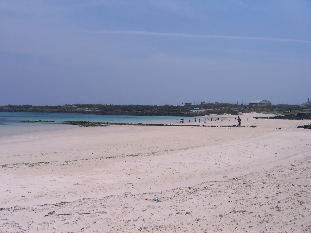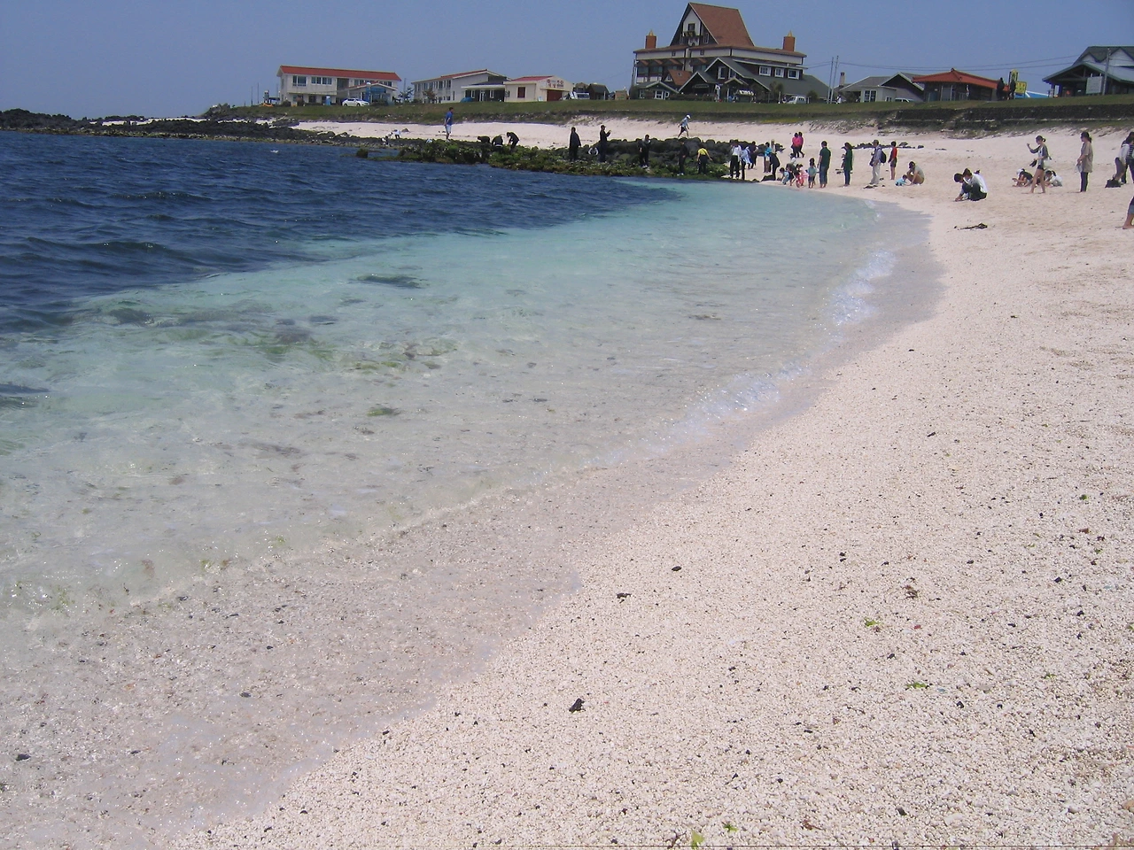 해변에 서서 바라보니 멀리 하우목동항으로 가는 배가 보이고 그 너머에는 지미봉과 종달항이 보인다. 바다색은 어김없이 여느 제주 바다처럼 에메랄드 옥빛으로 출렁이고 하얀 모래와 밀려오는 파도는 그 안까지 투명하게 자기 모습을 보여 주고 있다. 제주에서는 흔하지만 육지에서는 결코 볼 수 없는 풍경이다. 사람들은 해변에서 저마다의 표정으로 사진을 찍으며 소중한 추억들을 담고 있고 어떤 이는 먼 바다를 바라보며 생각에 잠겨 있다.