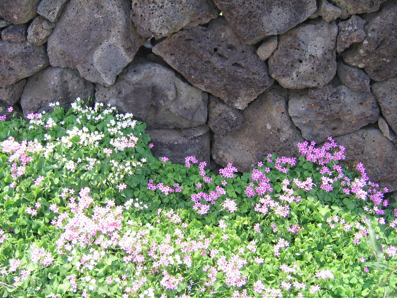 돌담 사이에 핀 유채와 들꽃, 초원 위 소가 풀을 뜯는곳.