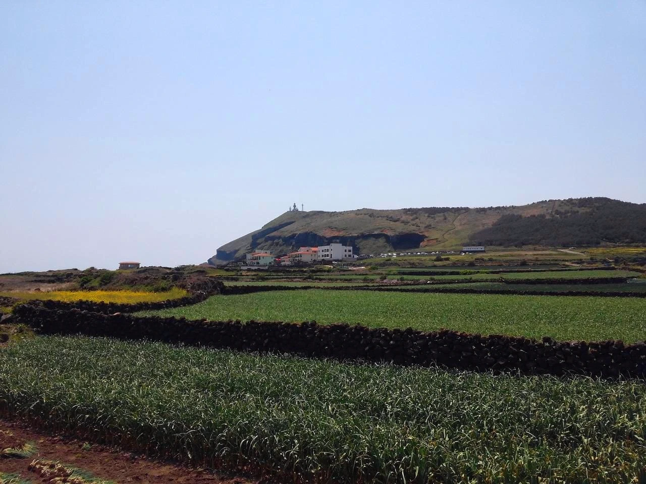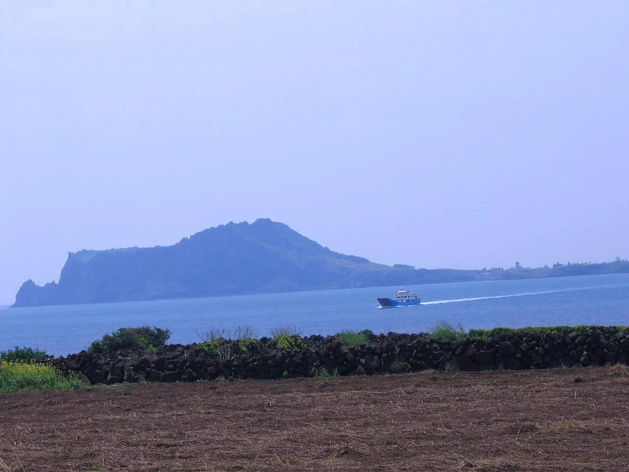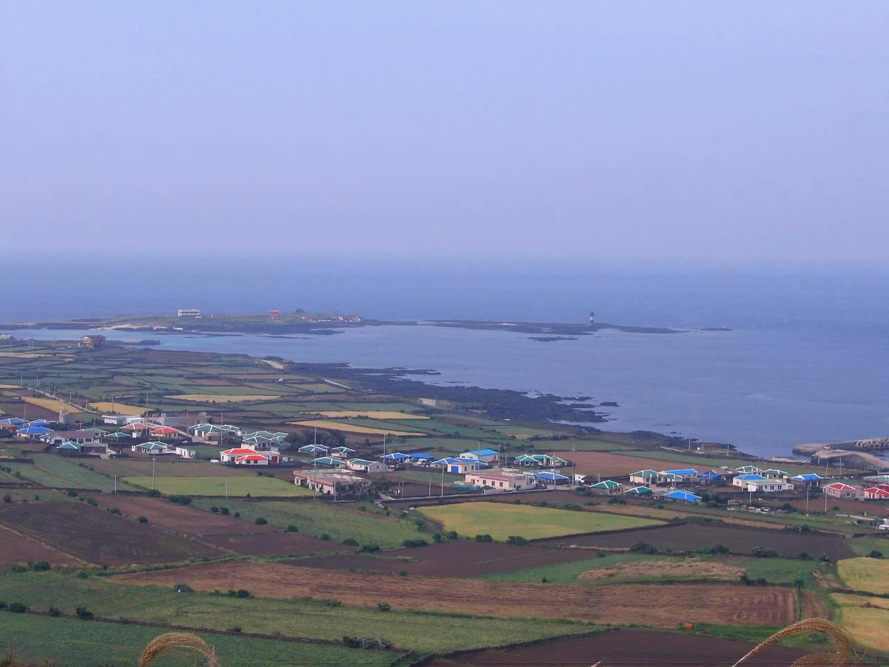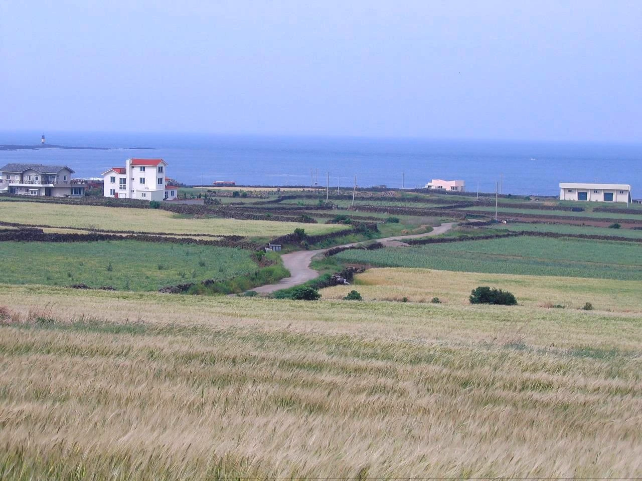 줄지어 있는 상점들을 지나 우도봉 입구에 서니 좀 전까지 걸어오며 보았던 집들과 건물들이 보이고, 보리밭 사이로 구부러진 길이 멀리 바다를 향해 나아가고 있다. 섬의 끝선과 바다의 수평선이 나란히 지나가며 그 앞에 펼쳐진 보리밭과 돌담은 보는 이의 마음을 후련하게 한다.