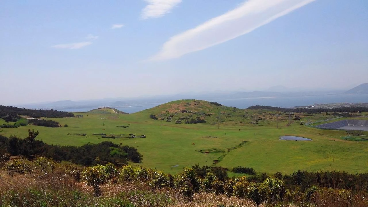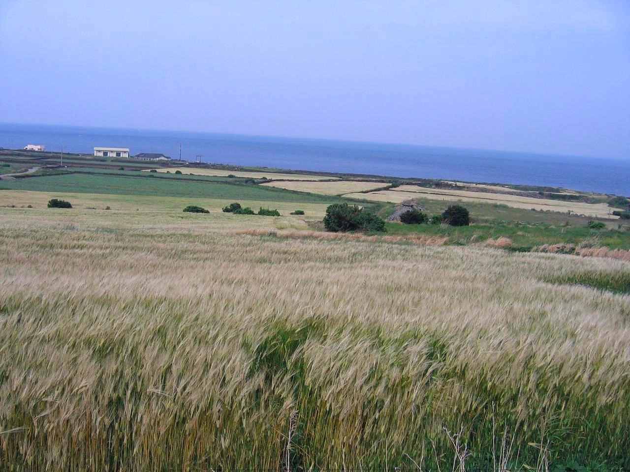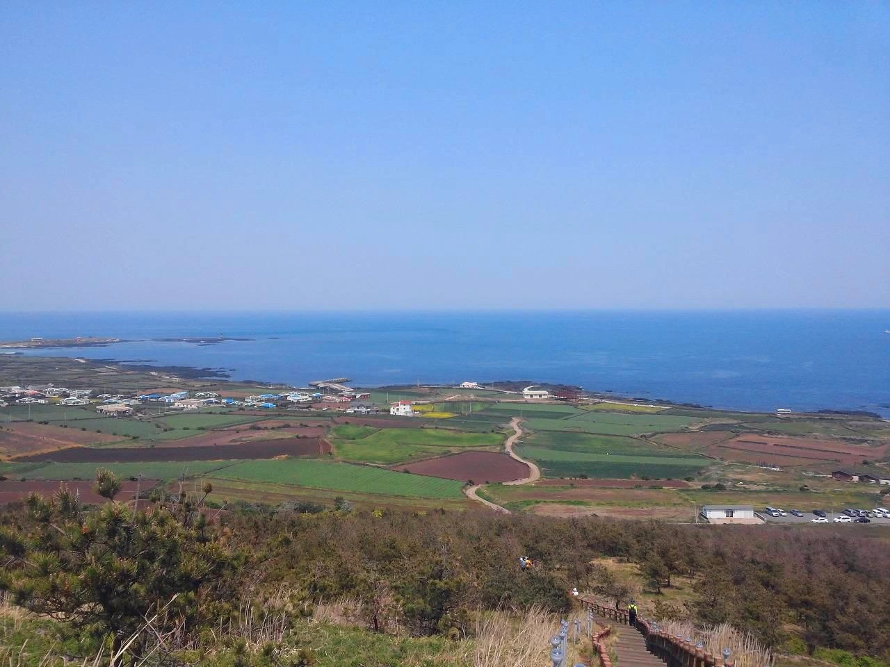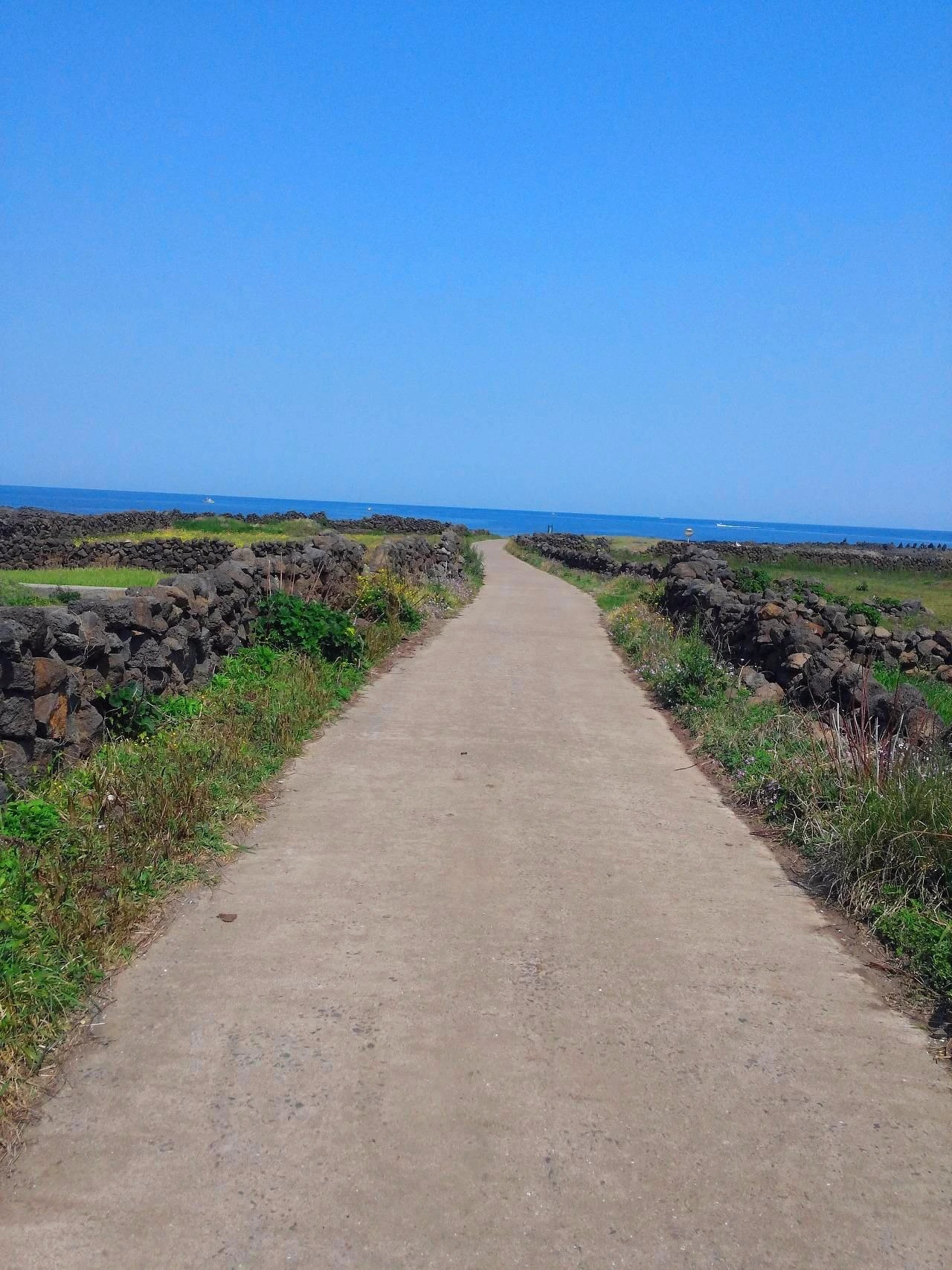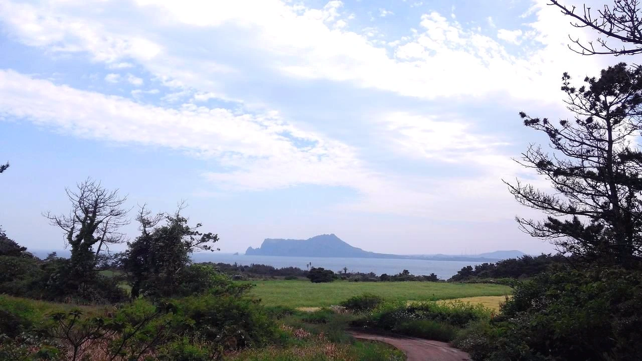 줄지어 있는 상점들을 지나 우도봉 입구에 서니 좀 전까지 걸어오며 보았던 집들과 건물들이 보이고, 보리밭 사이로 구부러진 길이 멀리 바다를 향해 나아가고 있다. 섬의 끝선과 바다의 수평선이 나란히 지나가며 그 앞에 펼쳐진 보리밭과 돌담은 보는 이의 마음을 후련하게 한다.