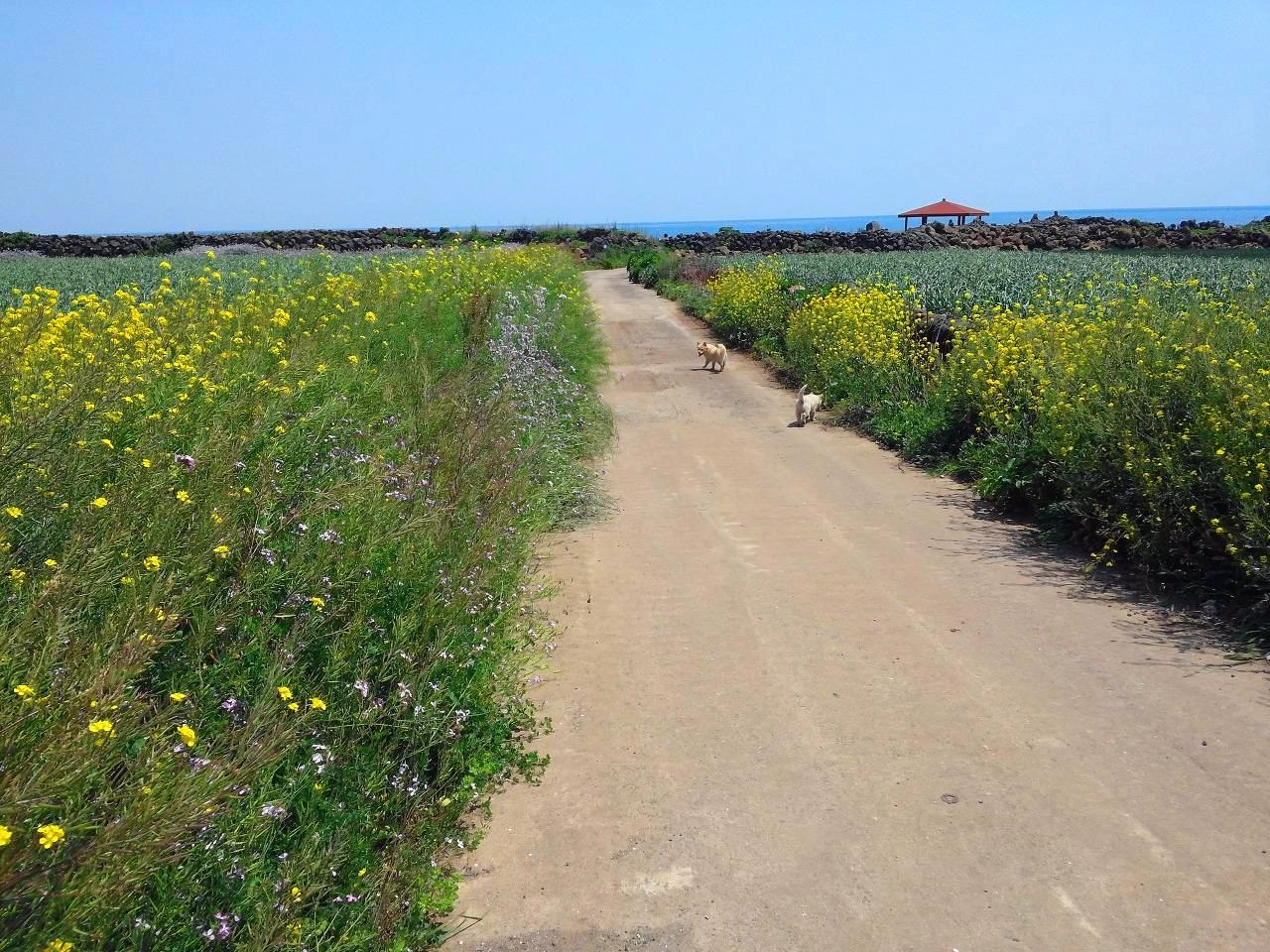 하고수동 해수욕장을 지나고 조일리 오거리를 지나니 길은 한적한 마을로 이어진다. 멀리 외곽도로에는 관광객들의 차가 지나가는 것이 보이지만 이곳은 아무도 지나지 않는다. 다만 어디서 나타났는지 강아지 두 마리가 노랗게 핀 유채꽃이 피어있는 길을 따라 올레꾼을 졸졸 따라오고 있다. 모른 척 걷다 뒤돌아보니 언제 그랬느냐는 듯, 멀직이 떨어져 나를 바라보고 있다. 아마도 한배에서 태어난 형제인 듯 싶다. 살랑살랑 불어오는 봄바람처럼 달랑달랑 꼬리를 흔들어 대는 녀석들이 귀엽기만 하다.