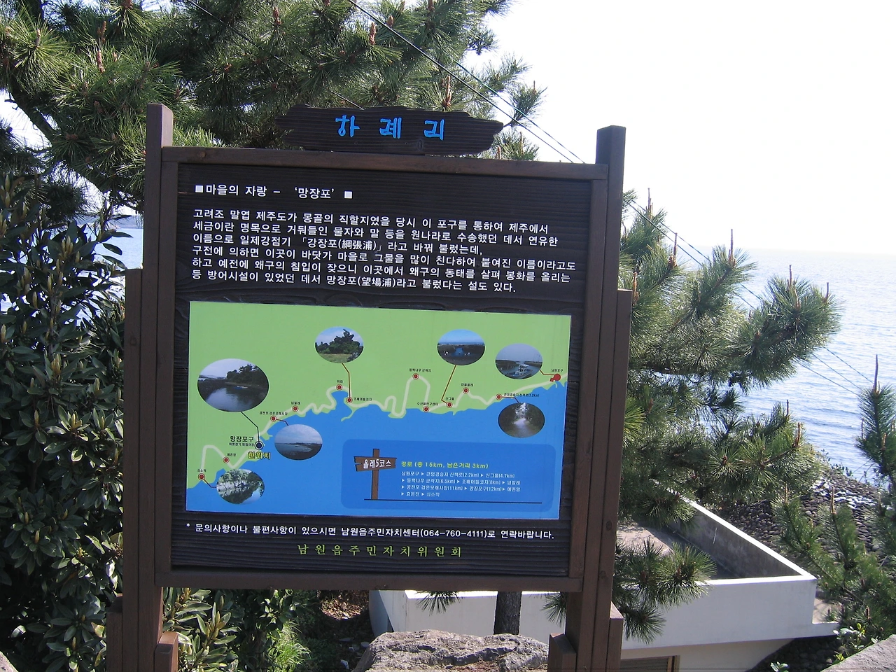 공천포를 지나 만나는 또 다른 포구인 망장포는 제주에 남아있는 포구 가운데 유일하게 옛날 포구의 원형을 간직하고 있는 포구이다. 이곳은 고려시대 말, 세금으로 거둔 물자와 말을 원나라로 보내던 포구로 이 지역에 그물을 많이 친다고 해서 '망장포'로 불려졌다. 포구로 들어오는 입구가 좁아 보이는 것이 그리 크지 않은 배들이 오고 가던 포구인 듯하다. 이곳은 비가 많이 오거나 바닷물이 들어오면 물 밑으로 잠기기 때문에 때로는 길을 우회하여 걸어야 한다.