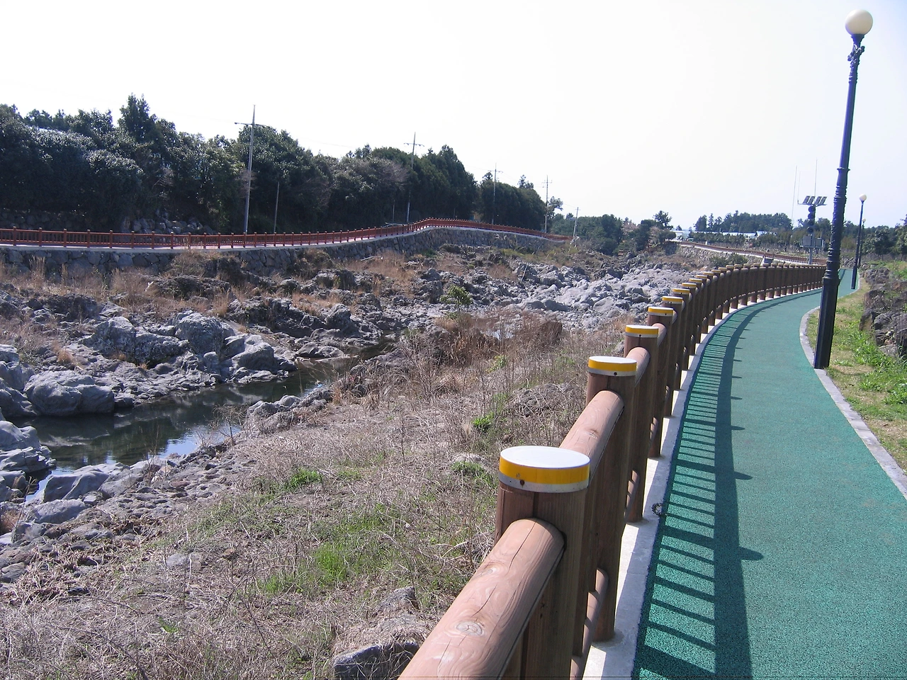 5코스 중 지나게 되는 '넙빌레'도 용천수가 나오는 곳 중 한 곳이다. '빌레'는 용암이 흐르면서 비교적 평평하게 쌓인 지형이라는 뜻이다. 그래서 이곳에는 바다와 근접하여 용천수가 흐르는 길목에 물을 가두어 벽돌로 주변을 낮은 담장처럼 쌓아 야외 목욕탕을 만들어 놓았다. 물론 남탕과 여탕은 구분이 되어 있고 여름에는 시원한 용천수에 몸을 담그며 피서를 즐기기도 한다. 한여름에 5코스를 걷는다면 아침 일찍 길을 시작하여 무더위가 절정인 한낮에는 용천수에서 잠시 쉬었다가 태양빛이 덜한 오후에 다시 길을 시작해도 좋은 방법이다.