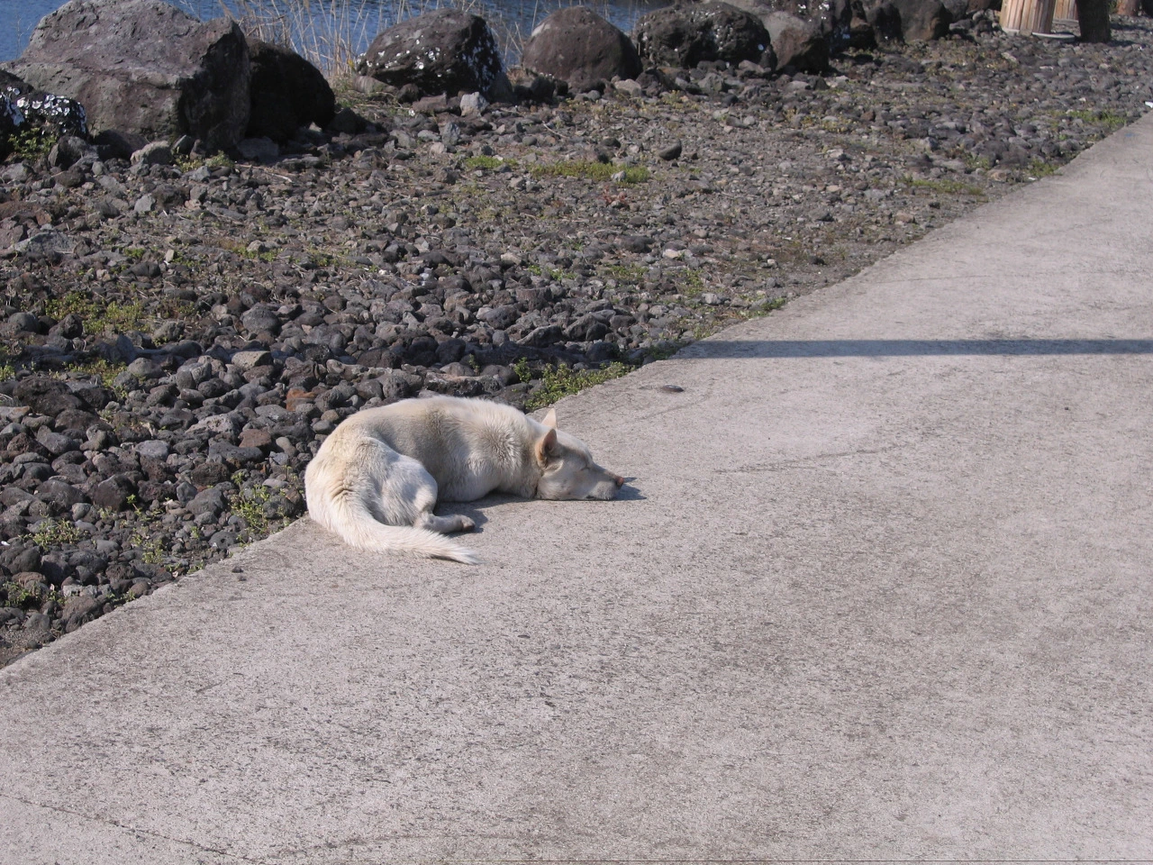 하지만 아름다운 봄날의 풍경에도 불구하고 동백의 이쁜 빛과, 미깡의 고운 색도 누구네 집 흰둥이의 마음을 빼앗기에는 부족했던 것 같다. 봄 볕이 잘 드는 길가에 올레꾼이 지나가도 모를 만큼 무심한 흰둥이가 길가에 납작 엎드려 낮잠을 즐기고 있다. 가까이 다가가 사진을 찍어도 아무런 기척이 없다. 따스하게 비추는 한가로운 봄 볕을 참기가 힘들었나 보다.