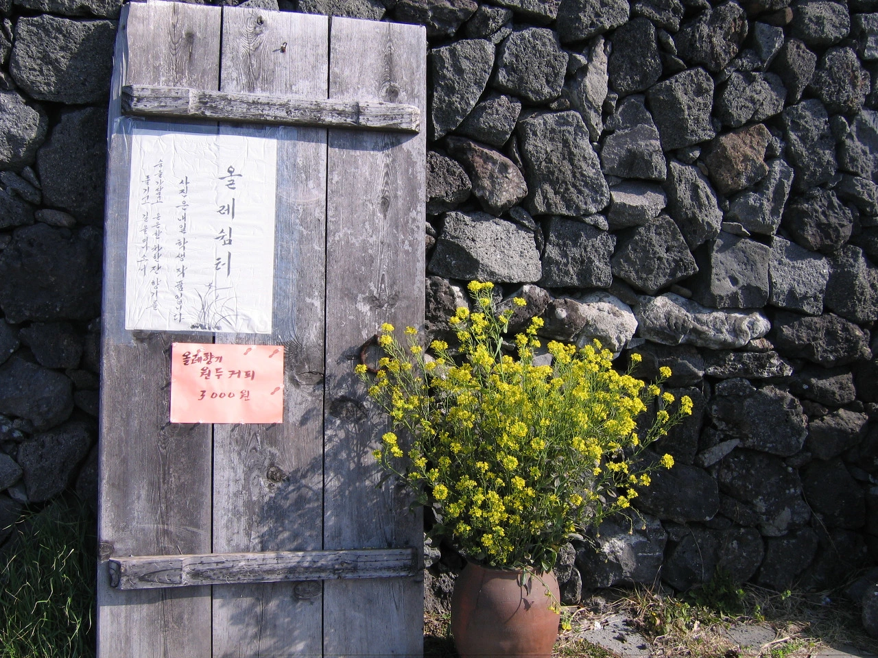 이름 없는 찻집의 주인은 황토색 꽃병에 유채를 한 아름 담아 거뭇한 돌담 앞에 놓아두었다. 올레꾼을 바라보며 하늘거리는 꽃의 손짓에 그냥은 지나칠 수 없어 향긋한 커피로 봄의 여유를 즐겨보려 문을 노크해본다. 하지만 인기척도, 대답도 없고 주인도 보이지 않는다. 아마도 어딘가에서 봄 풍경을 감상하며 봄 볕에 취했있나 보다. 아쉬운 올레꾼의 마음을 달래 주듯 꽃병에 담긴 유채만이 그저 환하게 웃고 있을 뿐이다.