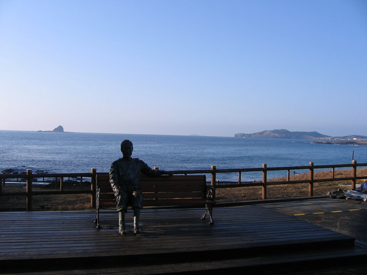 아까부터 벤치에 어떤 사람이 앉아 있는 것이 보인다. 좀 멋있어 보인다. 그런데 미동도 없이 앉아 있는 모습이 좀 이상하다. 가까이 다가가 보니 형제섬이 보이는 바다를 배경으로 여유롭게 앉아 있는 하멜의 동상이었다. 그 형상이 너무 자연스러워 왠지 그의 곁에 앉아 정다운 표정으로 사진에 담아야 할 것만 같다. 하지만, 주변에 사진을 부탁할 지나가는 이도 없고, 어떤 서양인 동상 옆에서 내가 나를 찍는 것도 숙기 없는 나로서는 참으로 어색한 일이다. 그냥 보는 것으로 만족할 뿐이다.