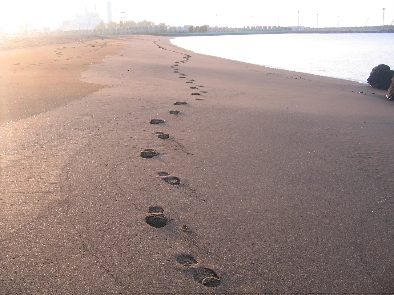 채비를 하고 금모래 해변에 서니 아침 햇살을 머금은 모래들이 금빛처럼 맨들 거리며 반짝거리고 있다. 너무 맨 초롬 하여 차마 밟기가 미안했지만 한 발짝을 내딛자 사각 하는 소리와 함께 찰지고 부드러운 느낌이 전해진다. 그 느낌이 좋아 넋을 놓고 걷다 뒤를 돌아보았다. 눈 부신 해변에 남아 있는 나의 발자국들이 보인다. 그리고 그 흔적들을 바라보며 내 마음이 나에게 말하고 있다. 움푹 파인 깊이만큼 천천히 가라고.
